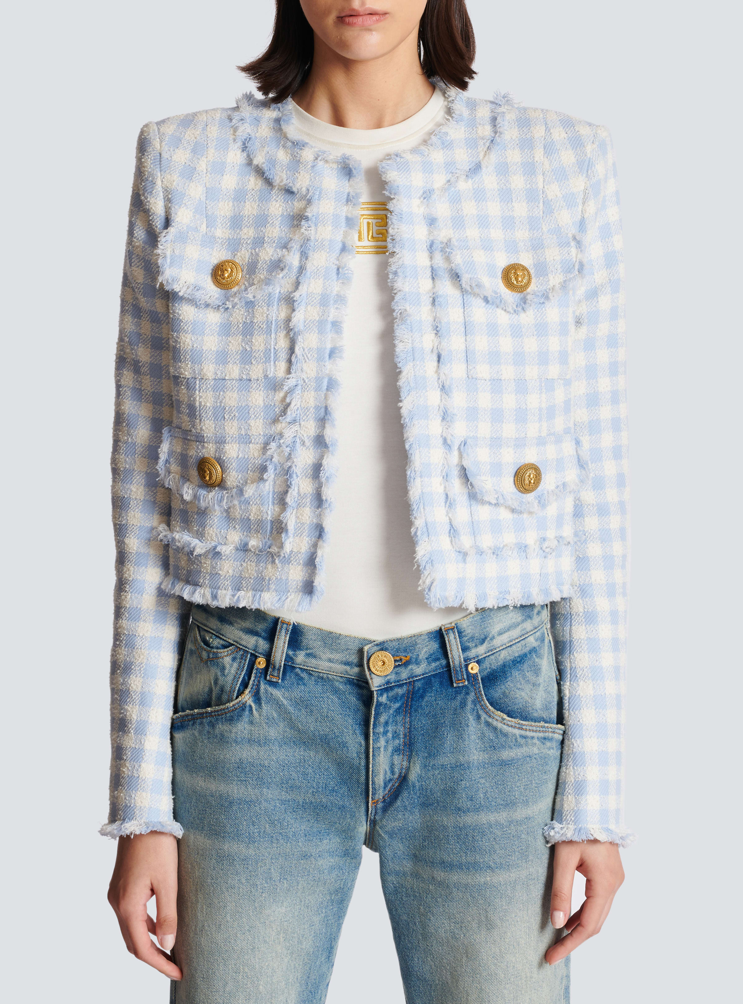 Cuối cùng không kém phần quan trọng đó là những chiếc áo khoác giữ ấm thân thể cho các tín đồ. Đối với thương hiệu Balmain, áo khoác không chỉ là mảnh vải để khoác ngoài có công dụng sưởi ấm, mà còn là một sản phẩm quan trọng, sở hữu thiết kế bắt mắt, có thể kết hợp với đa dạng trang phục. Điển hình là mẫu Gingham Tweed Jacket, cũng như bao dòng sản phẩm Gingham Tweed khác, chiếc áo có chất liệu chính là cotton và polyamide, đảm bảo về sự ấm áp và độ bền bỉ cho người mặc. Áo có kiểu dáng straight shortcut cùng form dáng thẳng và ngắn, tạo ra vẻ ngoài hiện đại đầy phong cách. Phần vai áo được cắt may chắc chắn cùng tay áo dài, sản phẩm tạo ra vẻ đẳng cấp và giữ ấm tốt. Phần cổ tay được làm tỉ mỉ khi đính kèm với 5 nút kim loại mạ vàng, mang đến sự sang trọng và thanh lịch. Áo còn được trang trí với 4 túi giả được đính 4 nút mạ vàng khiến cho mẫu áo trở nên đẳng cấp hơn bao giờ hết. Với mẫu áo này, bạn có thể phối cùng với chiếc quần Western Bootcut Denim Jeans hay chân váy Gingham tweed A-line để trở nên thật thanh lịch và sang chảnh, có chút dịu dàng, nữ tính trong mắt mọi người nhé.