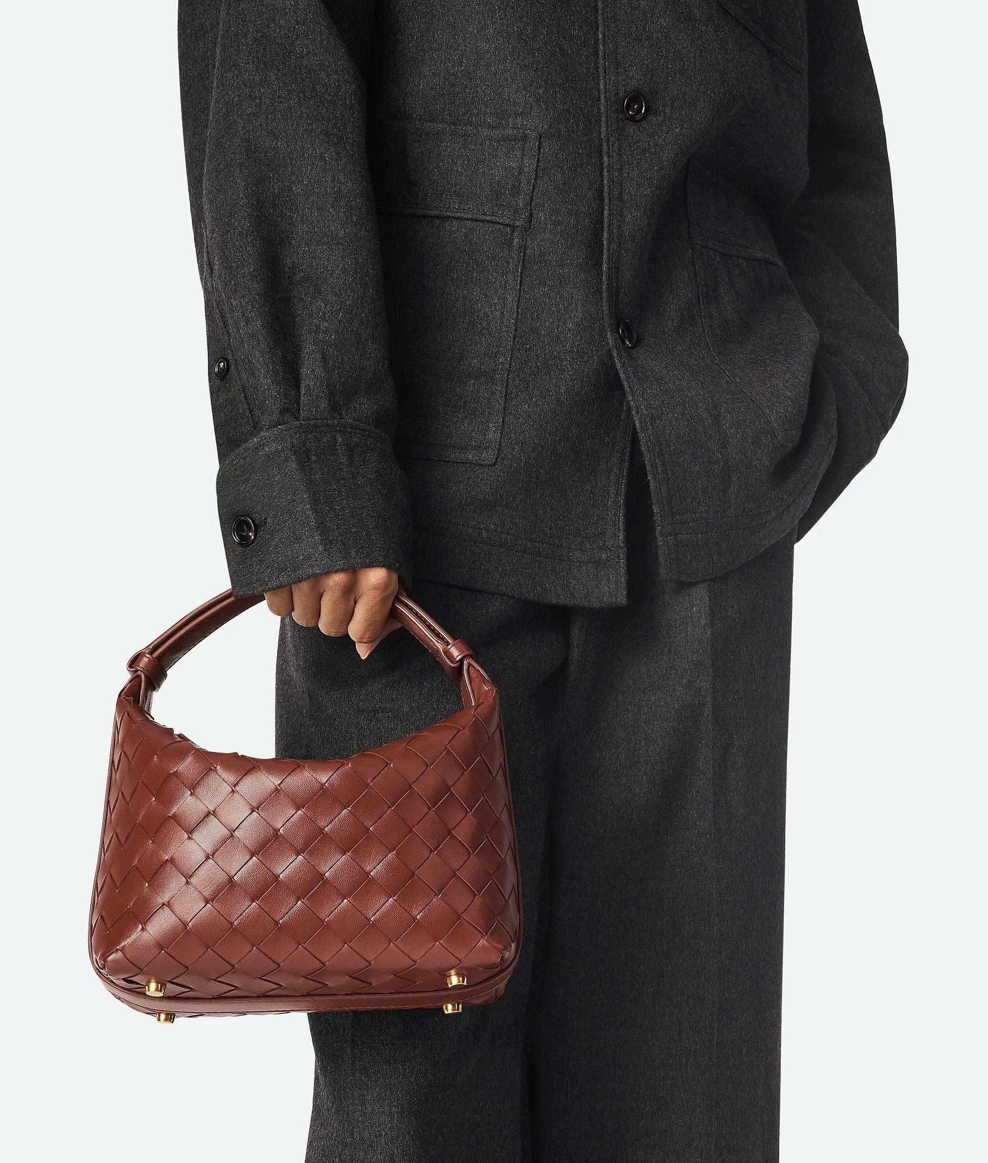 Shoulder bag with Intrecciato craftsmanship in calf leather featuring an adjustable