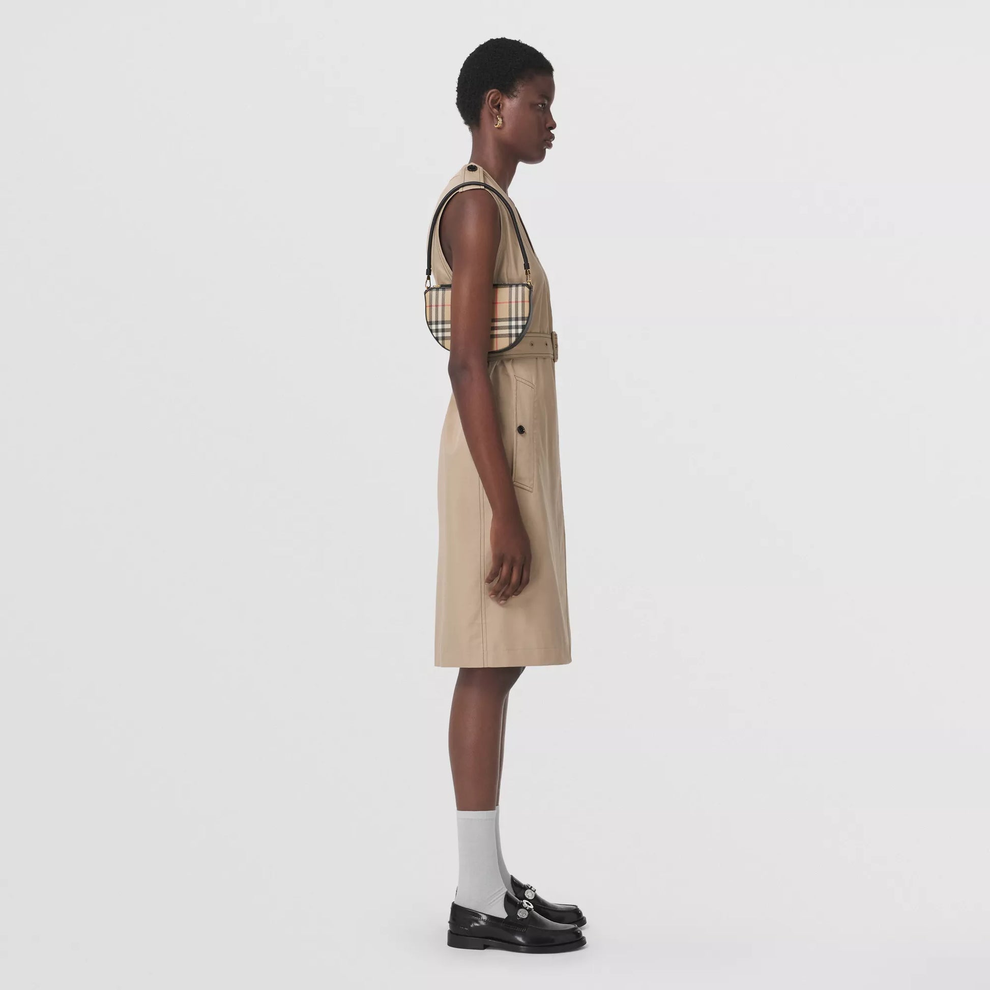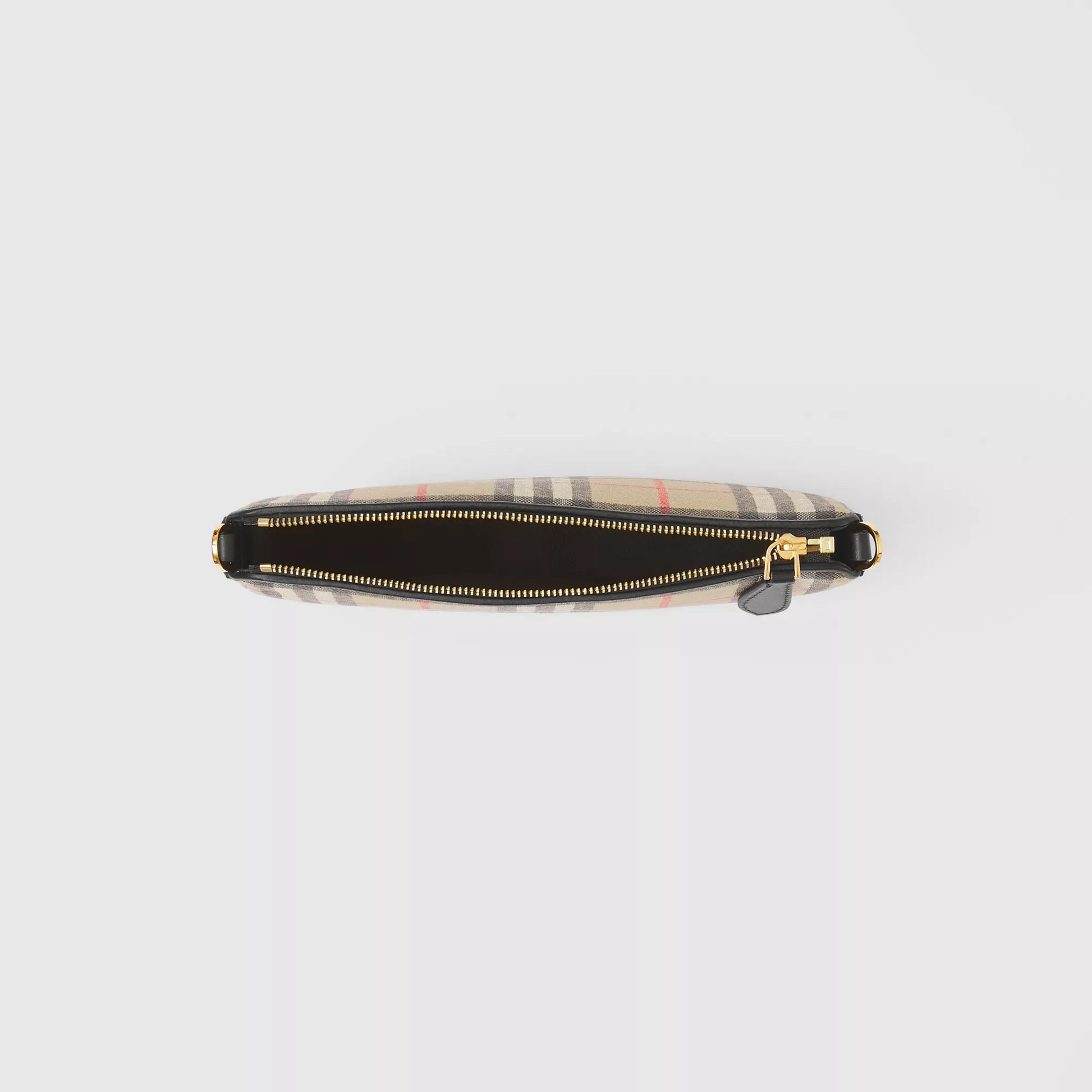 - A slim pouch in Vintage check and leather, with a curved silhouette – inspired by the architecture of our show venue, Olympia London. Wear on the shoulder or detach the strap to carry as a clutch.