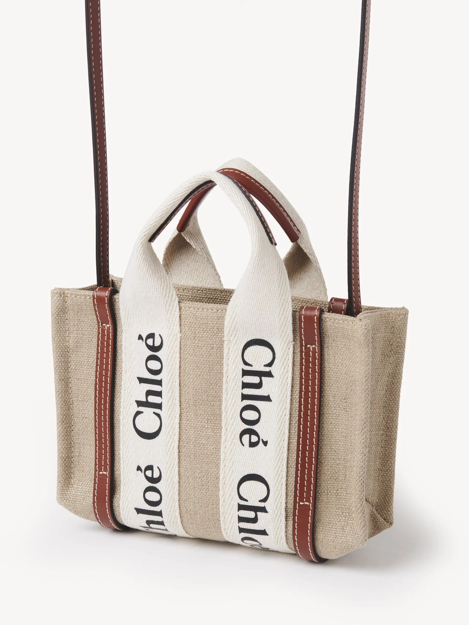 Showcasing all the features of the iconic Woody line in a surprising nano silhouette with a single main compartment, this Woody nano tote bag is made from linen canvas detailed with shiny calfskin strips.