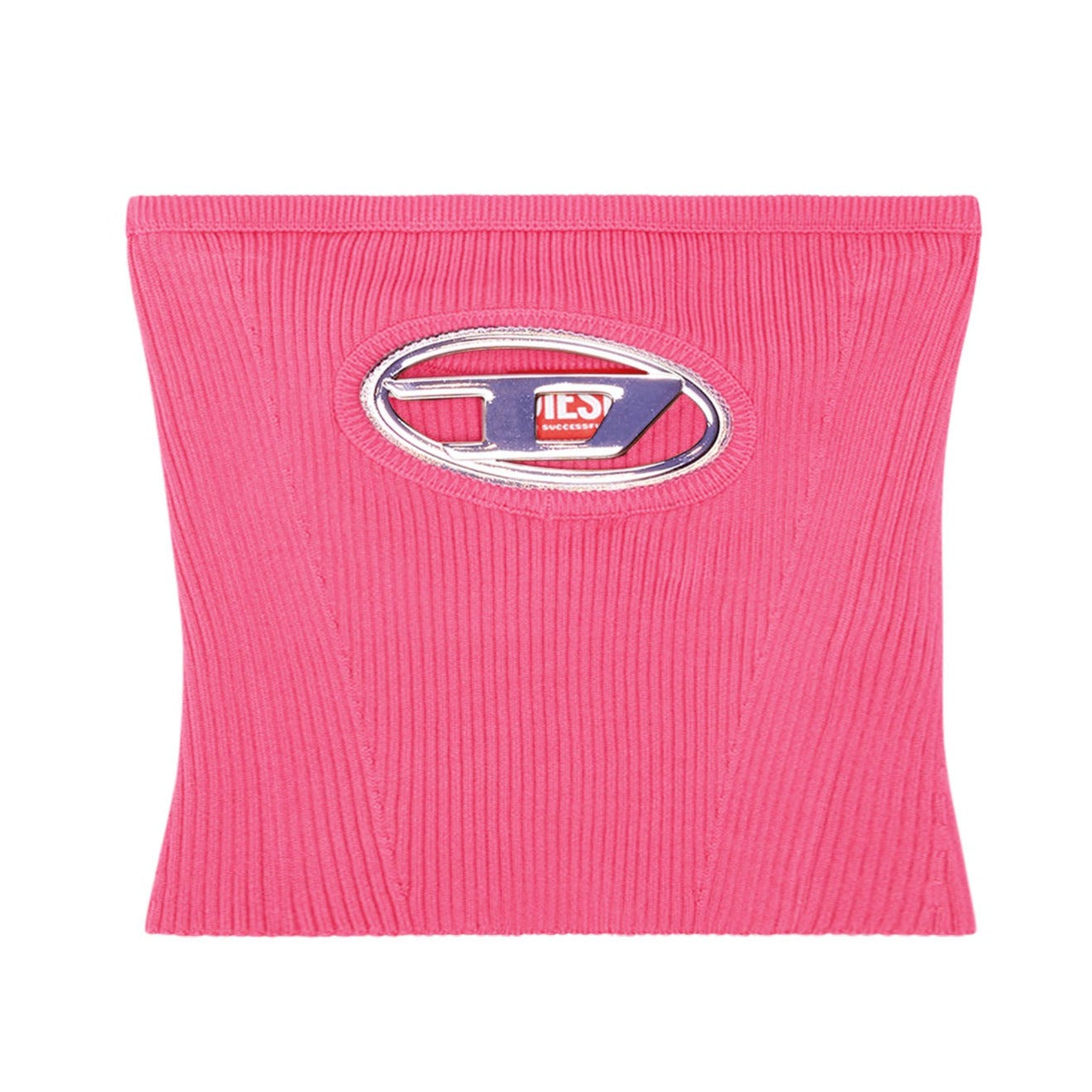 Women's slim-fit bandeau top cut from a stretchy ribbed viscose blend. The chest is encrusted with a metal oval D plaque for a peek-a-boo effect.