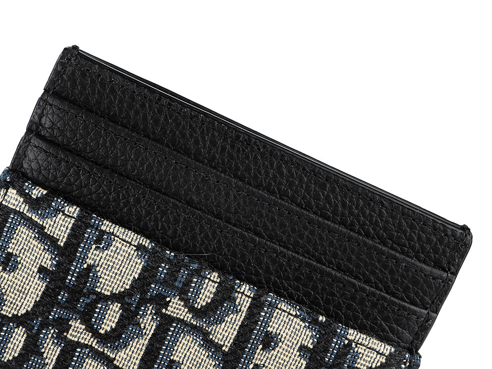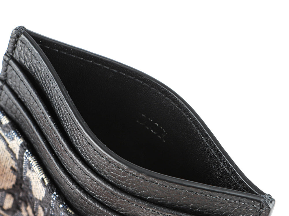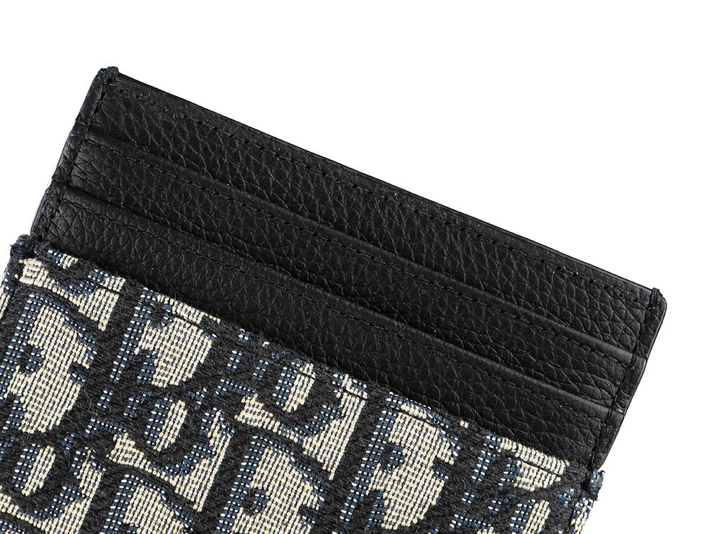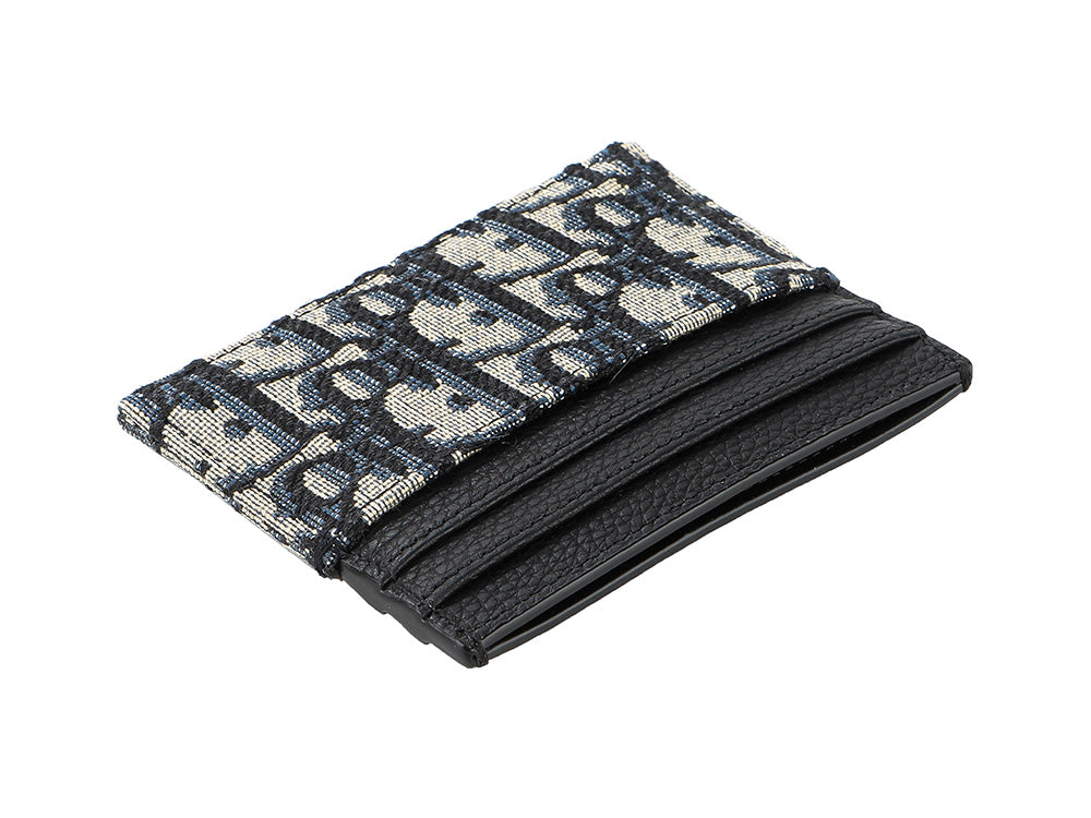 The card holder is a practical piece with refined charm. Crafted in beige and black Dior Oblique jacquard and black grained calfskin, it showcases the ruthenium-finish brass Dior signature and features three slots in the front and back as well as a top card slot to carry personal effects. The elegant card holder will easily slip into any pocket.