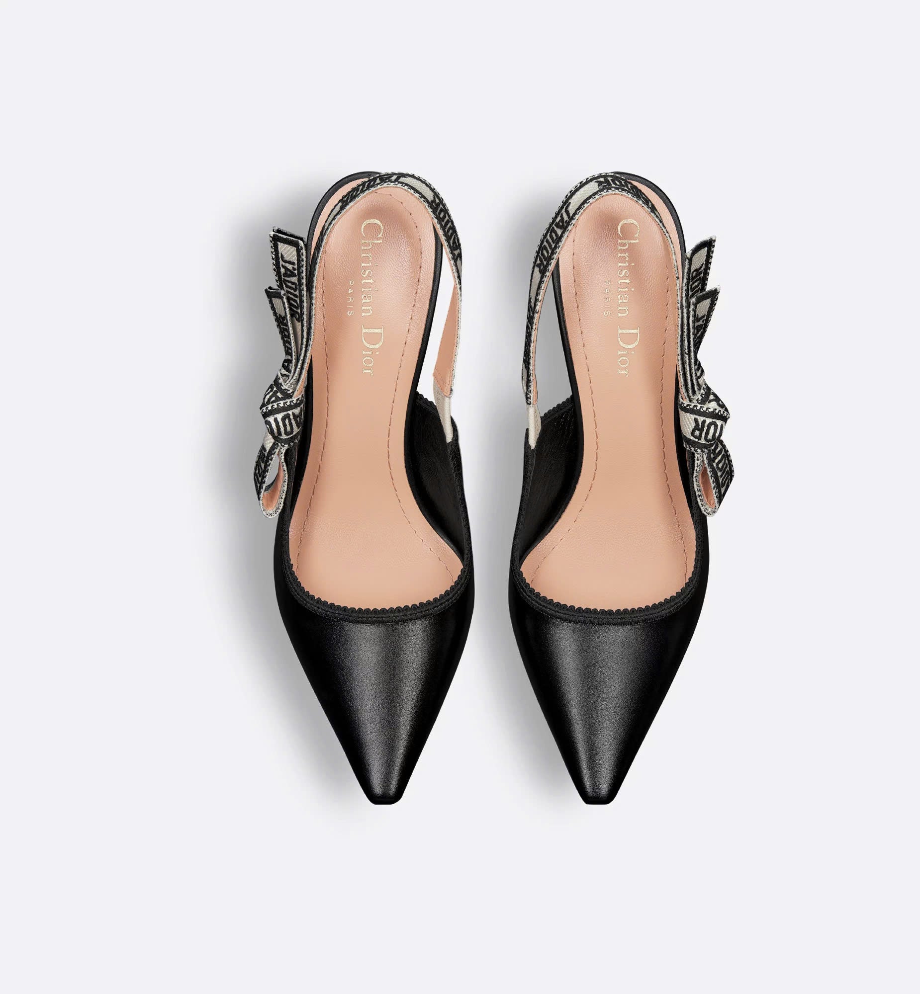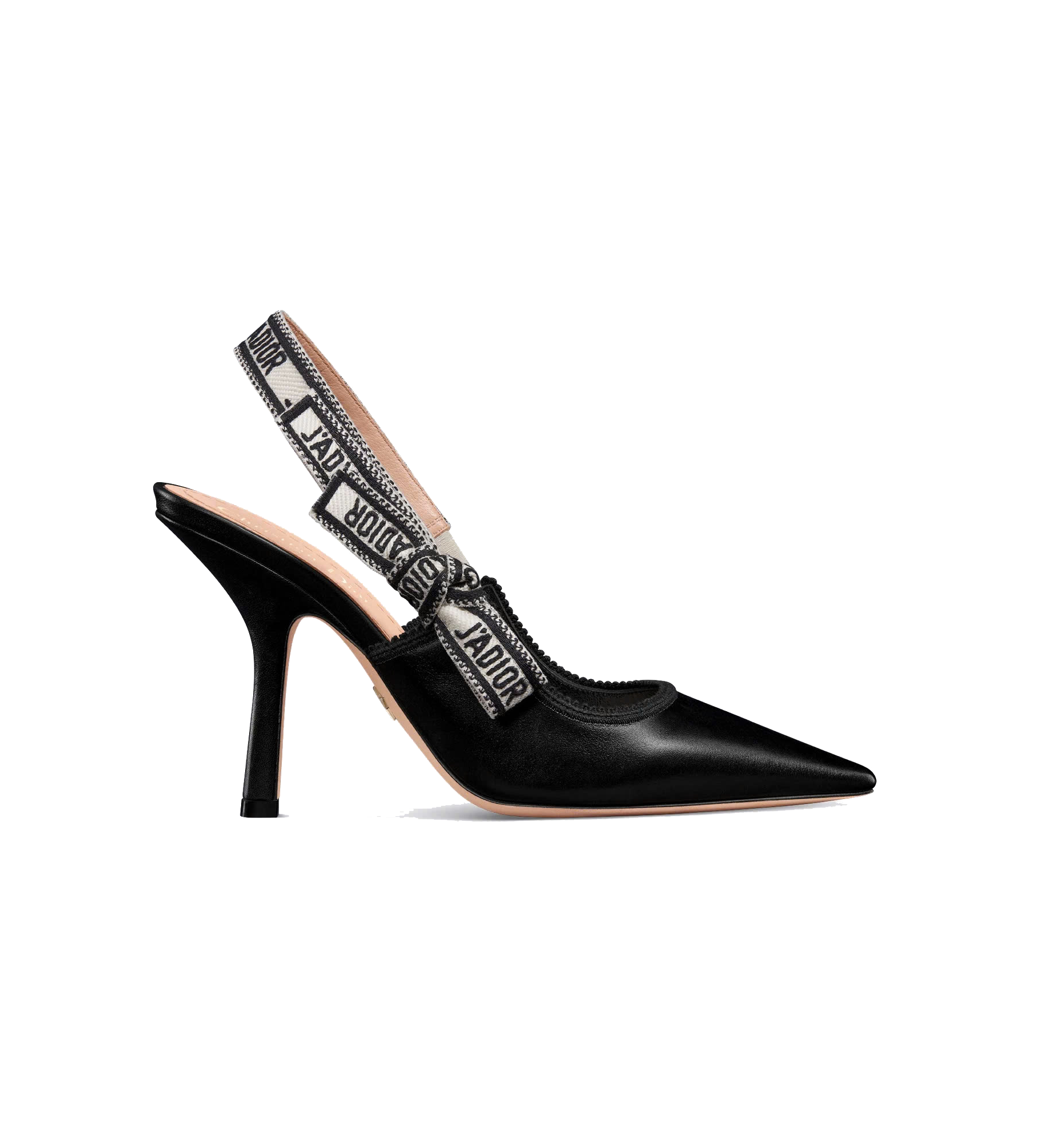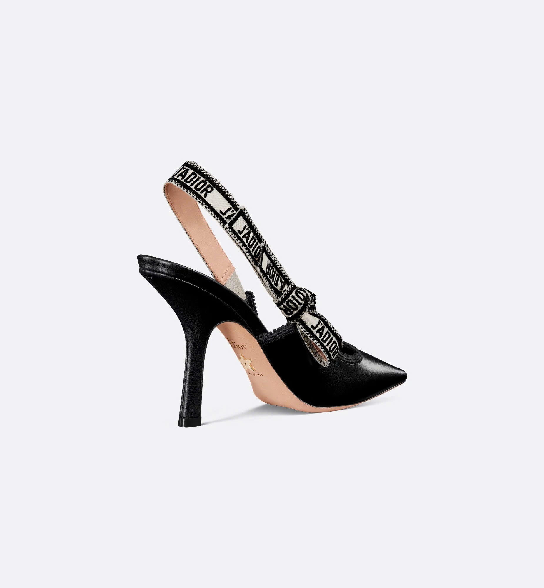 The J'Adior slingback pump is a prime example of Dior's savoir-faire. Crafted with passion in Christian Dior's Italian ateliers, the silhouette is distinguished by black calfskin. The J'Adior two-tone embroidered ribbon is embellished with a flat bow, and a 10-cm (4) comma heel offers an elegant and refined finishing touch.