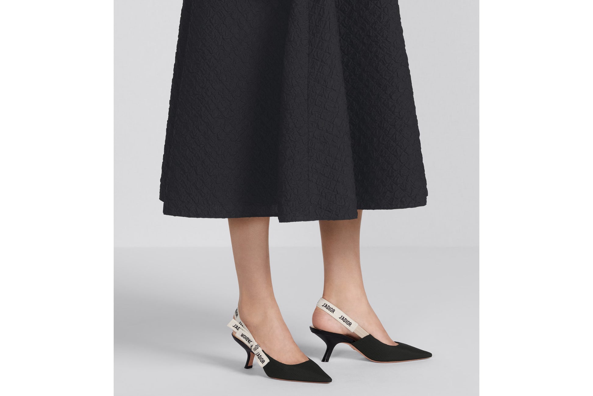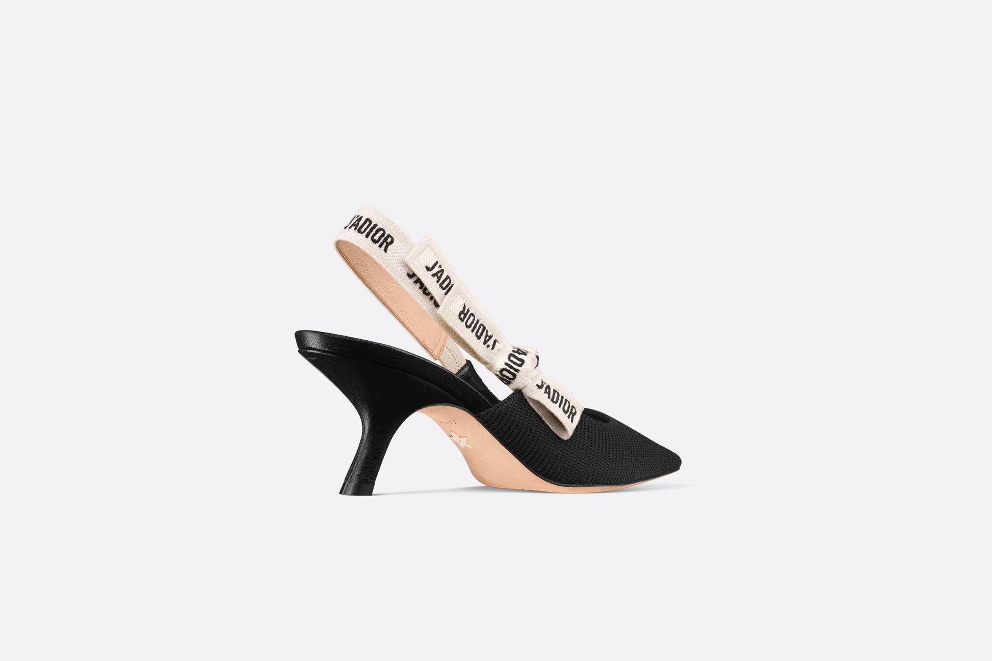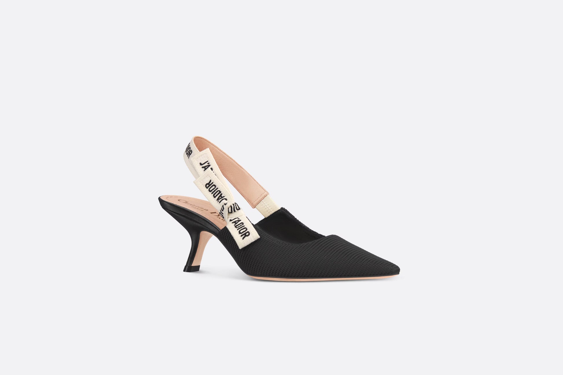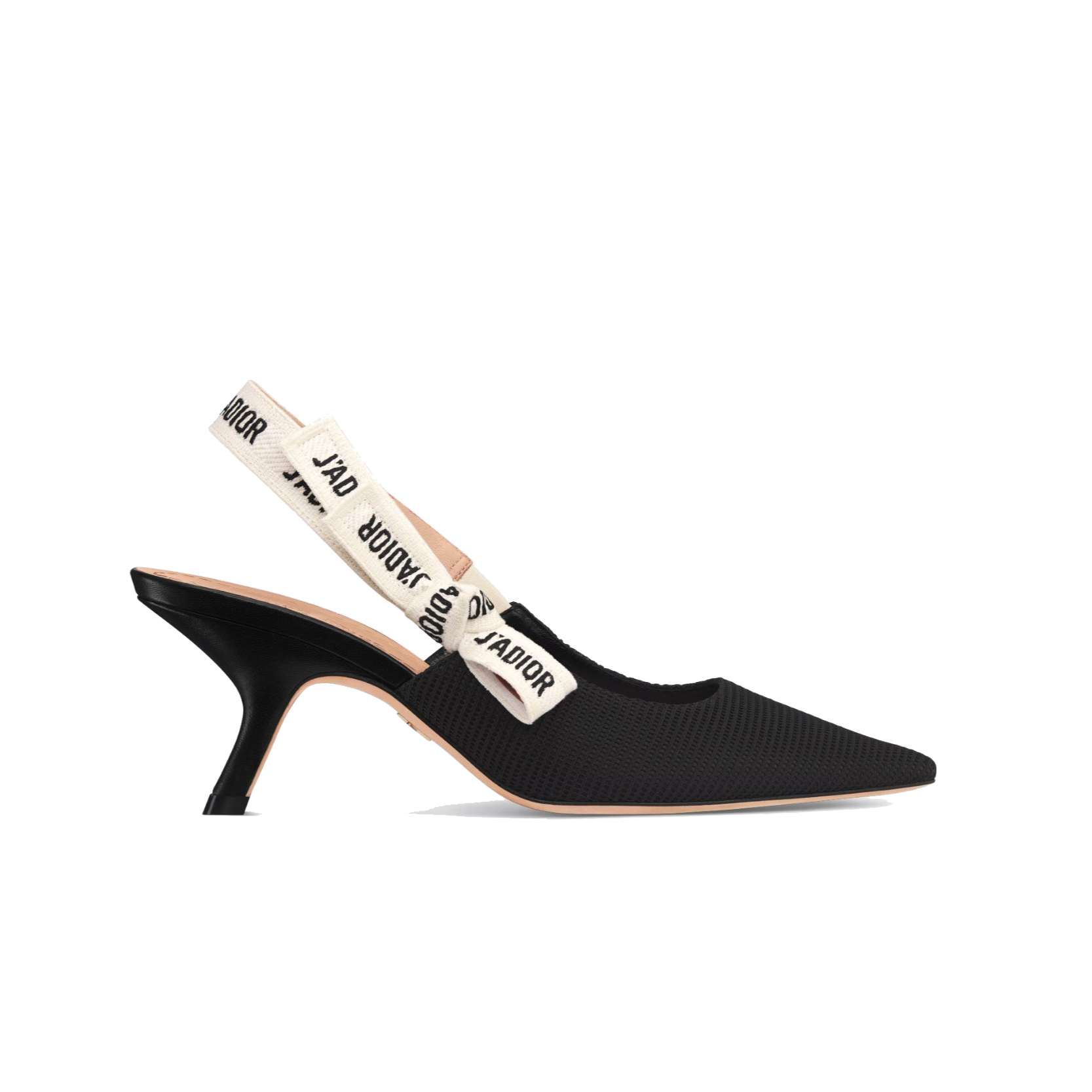 The J'Adior slingback pump is a prime example of Dior's savoir-faire. Crafted in the Christian Dior Italian ateliers, the silhouette is distinguished by black technical fabric. The two-tone embroidered 'J'ADIOR' ribbon is embellished with a flat bow and the 6.5 cm comma heel offers the final elegant touch.