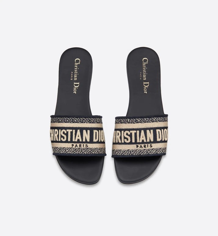 The Dway slide has a timeless and emblematic silhouette. The slide's upper features a deep blue embroidered 'CHRISTIAN DIOR' signature and instantly stands out. The streamlined shoe slips on easily and offers effortless style.