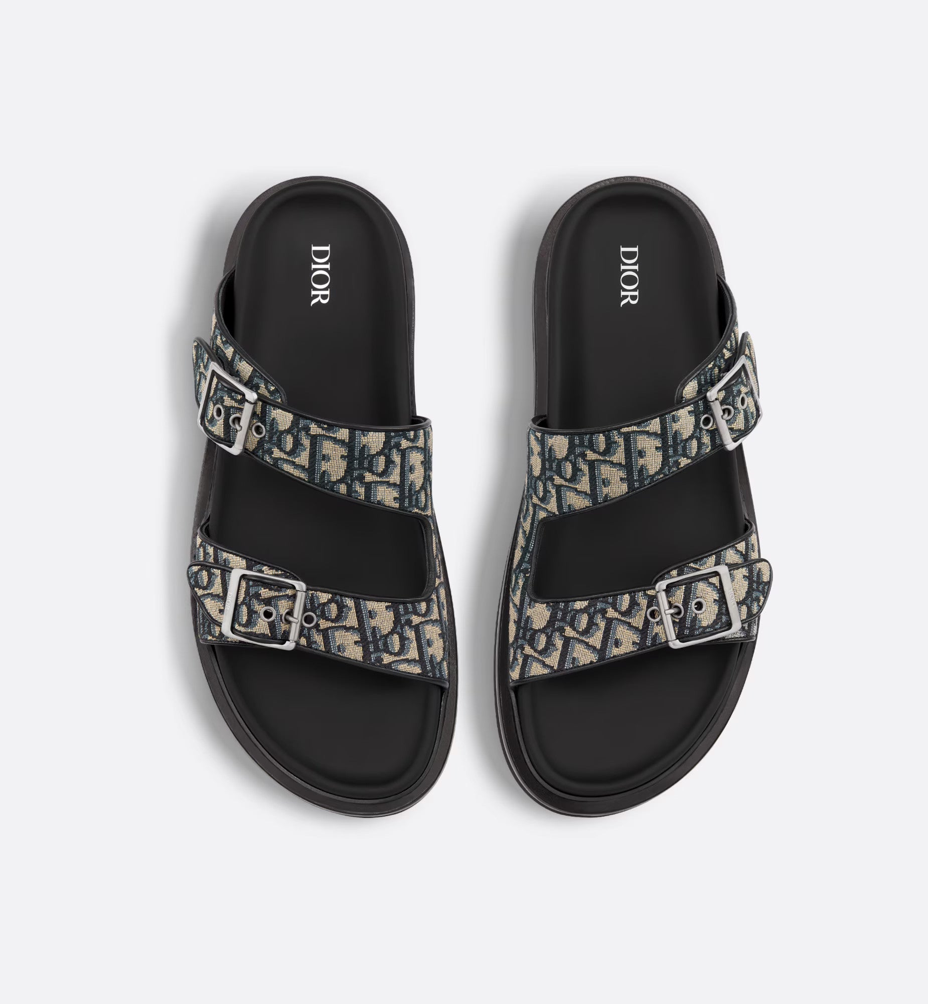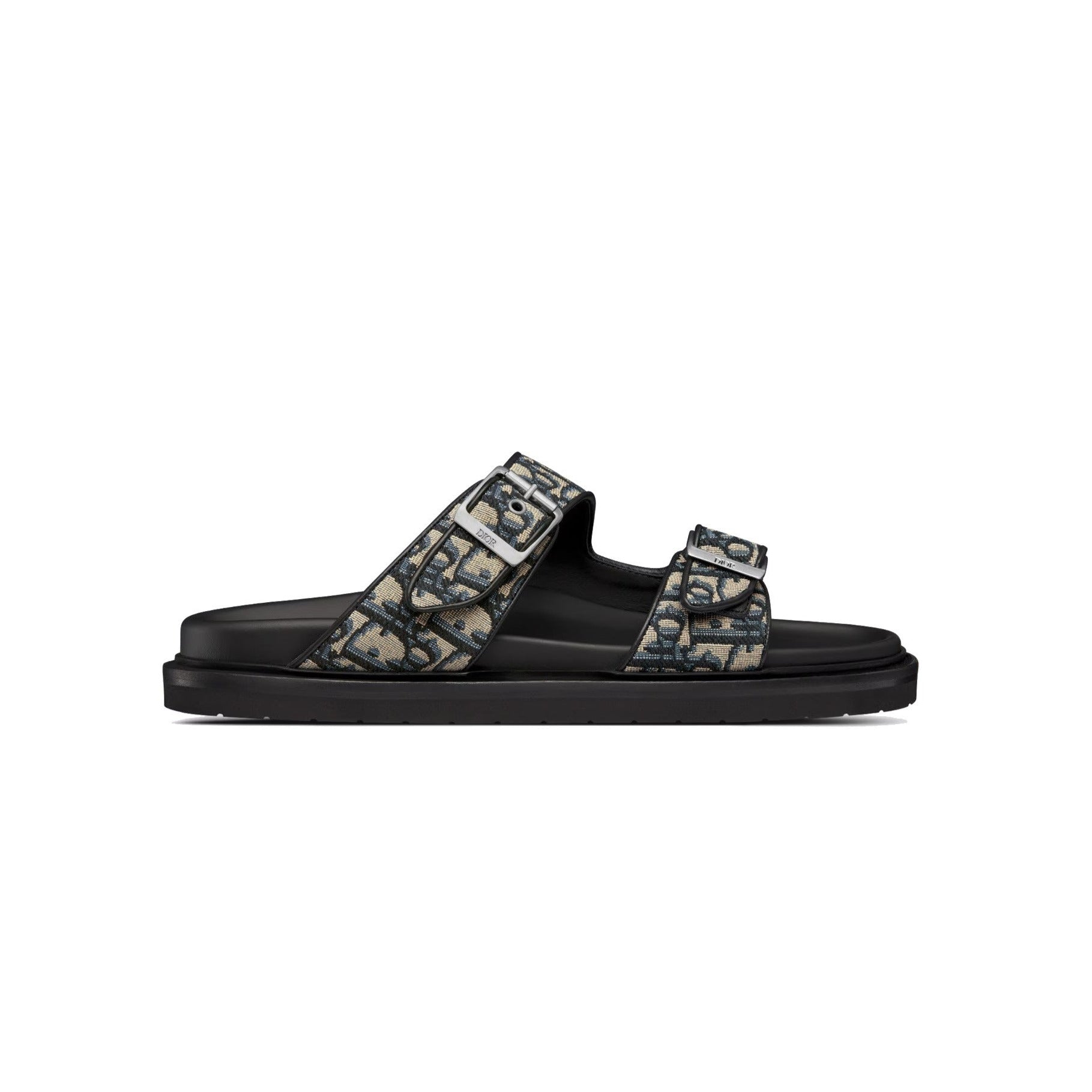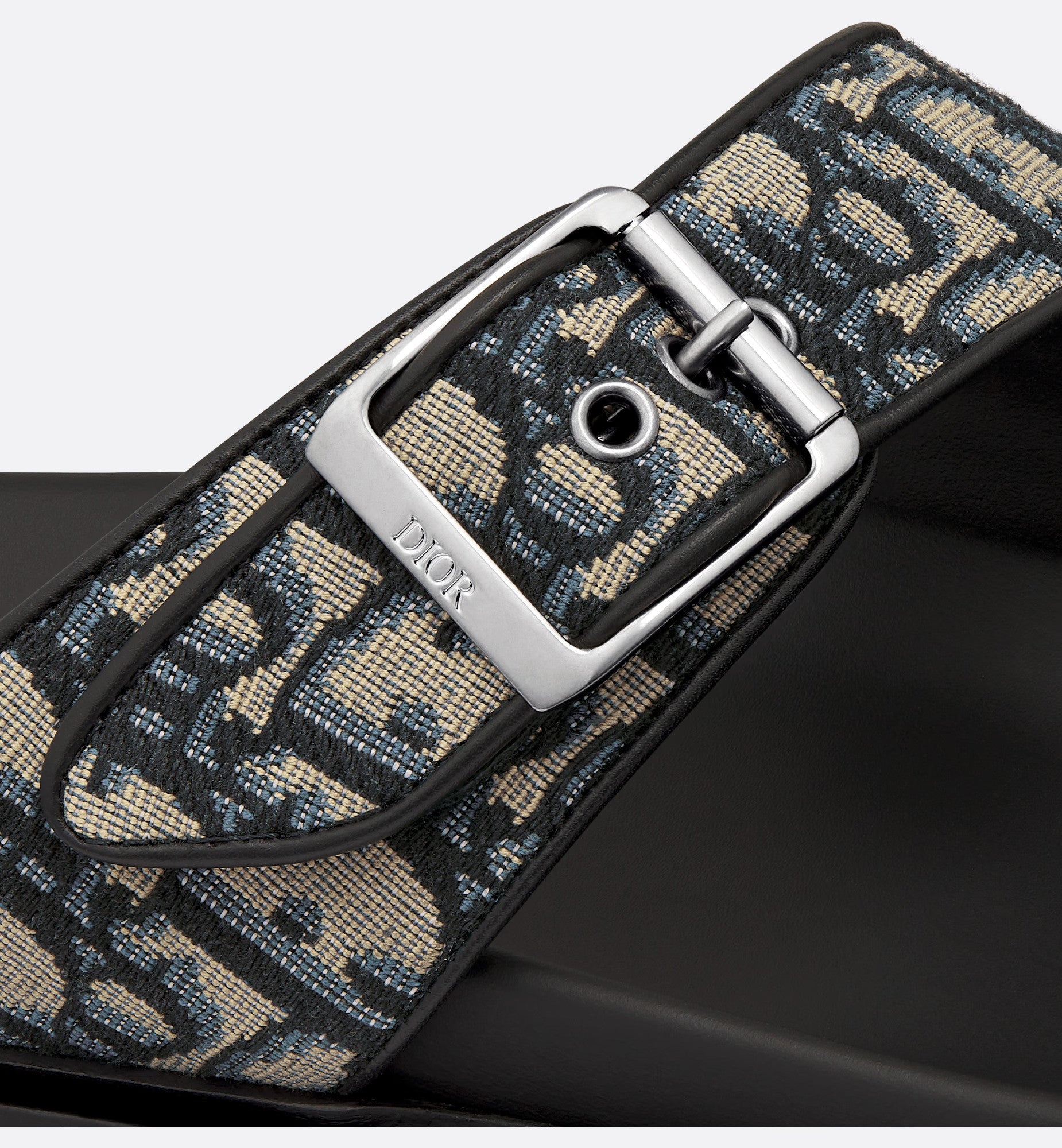 The Dior Aqua sandal offers an elegant style with relaxed appeal. The design presents a new adjustable strap variation, highlighting the House's hallmark beige and black Dior Oblique jacquard. Completed by a Dior signature on the buckle and tonal notched sole, the sandal will pair easily with Bermuda shorts or jeans.