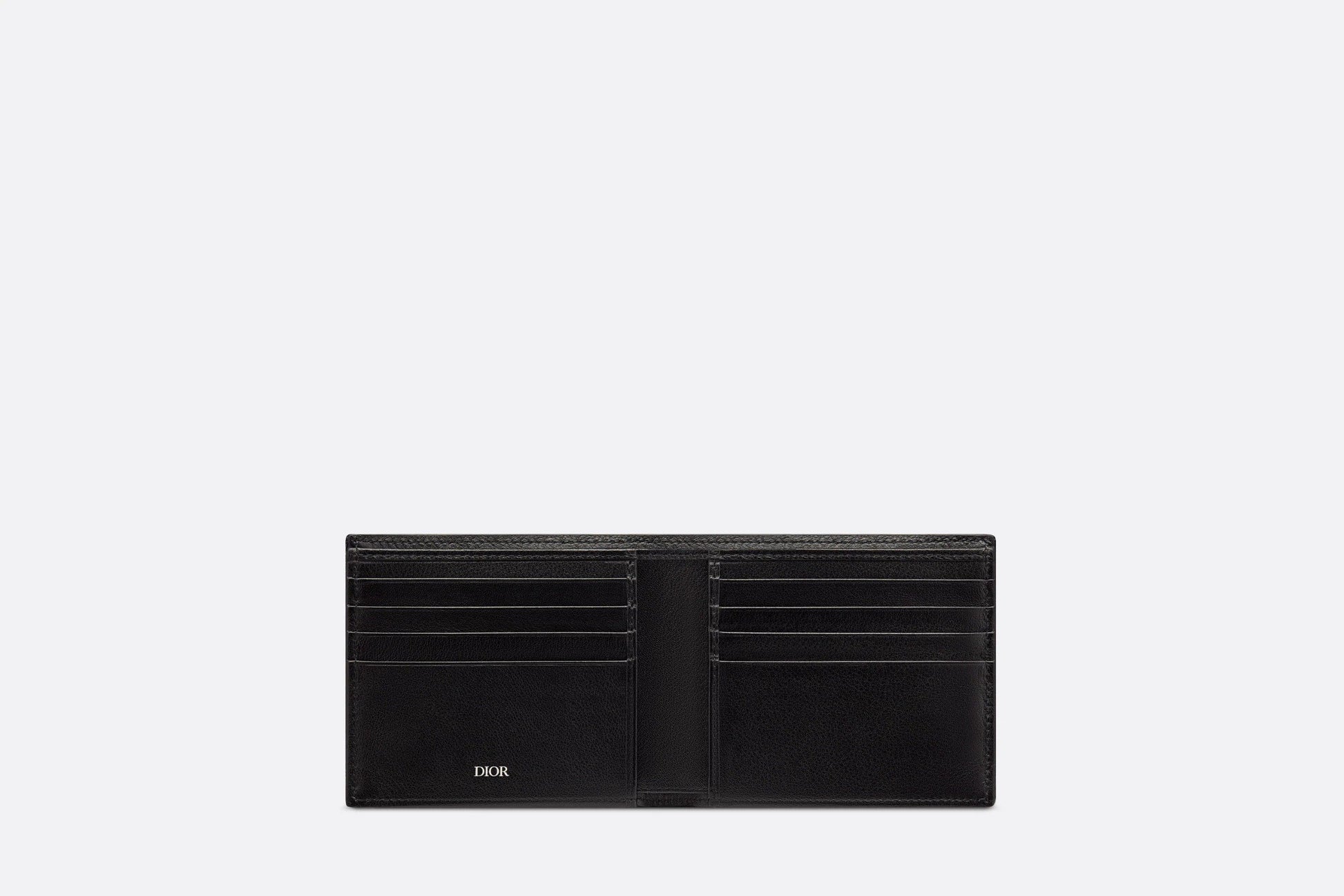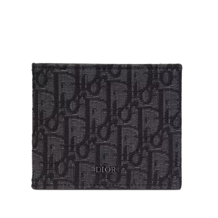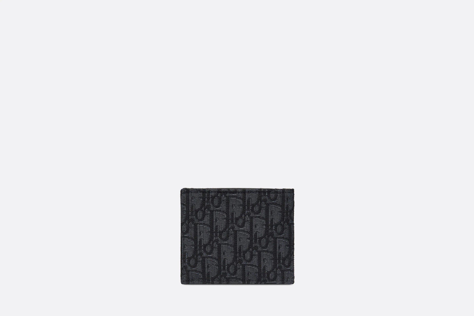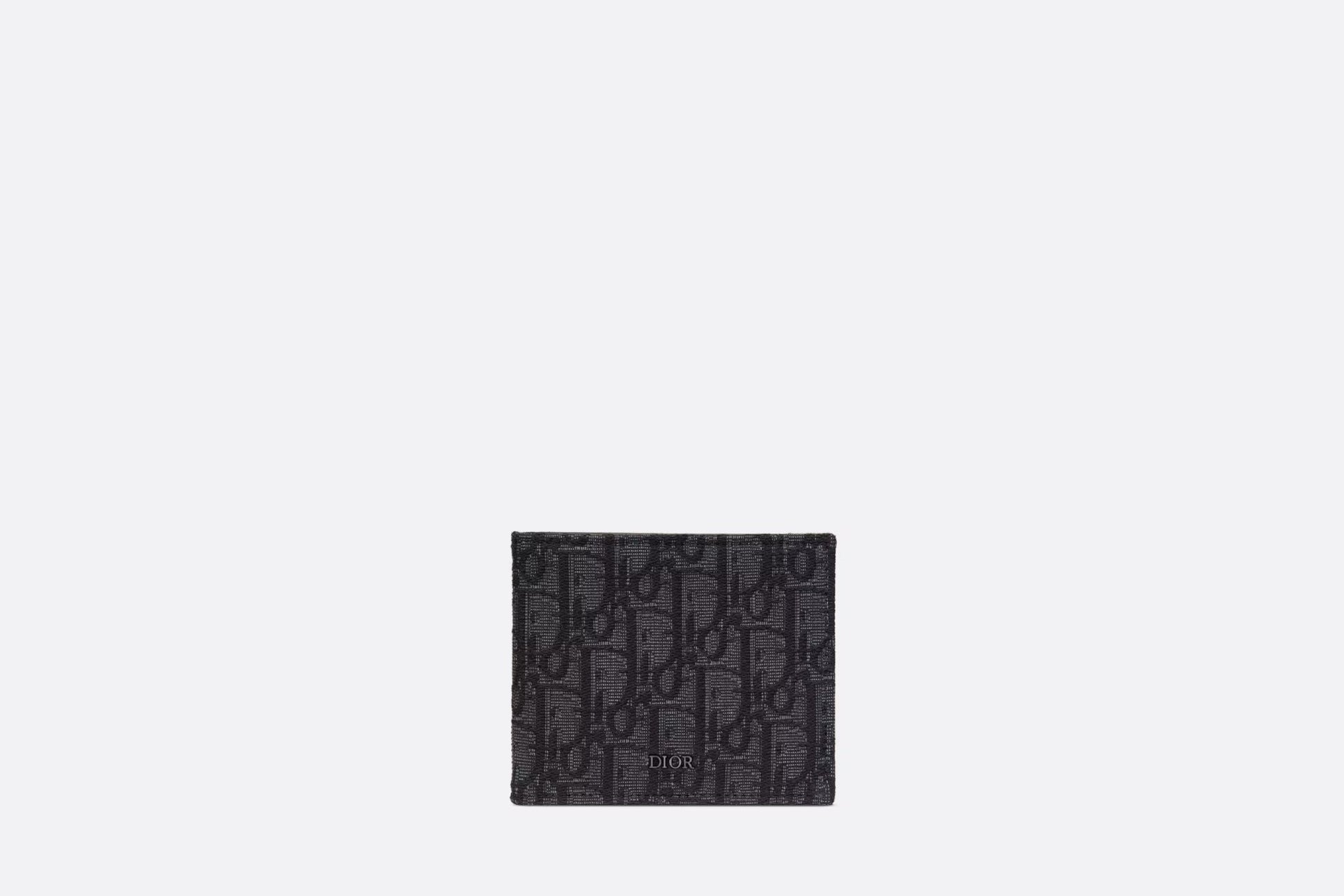 The wallet is a compact accessory with a refined look. Crafted in black Dior Oblique jacquard, it showcases a ruthenium-finish brass Dior signature on the front. The interior features a double bill holder, two flat compartments and eight card slots. The bi-fold wallet will slip into pockets and bags with ease.