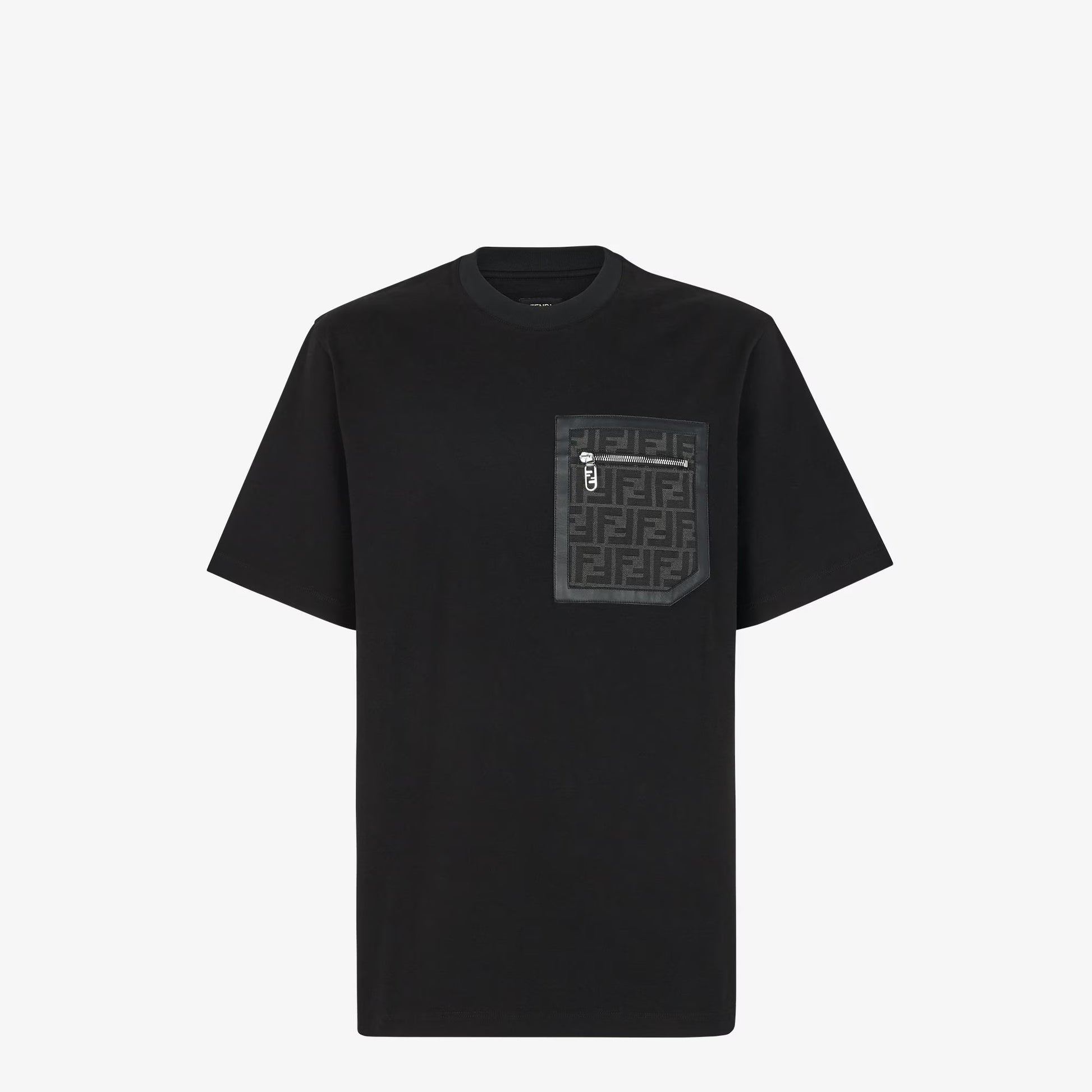 Skater-style T-shirt with zip pocket on the chest. Crew neck and short sleeves. Made from black cotton jersey. The breast pocket is embellished with a jacquard FF fabric insert and leather trim in the same colours.