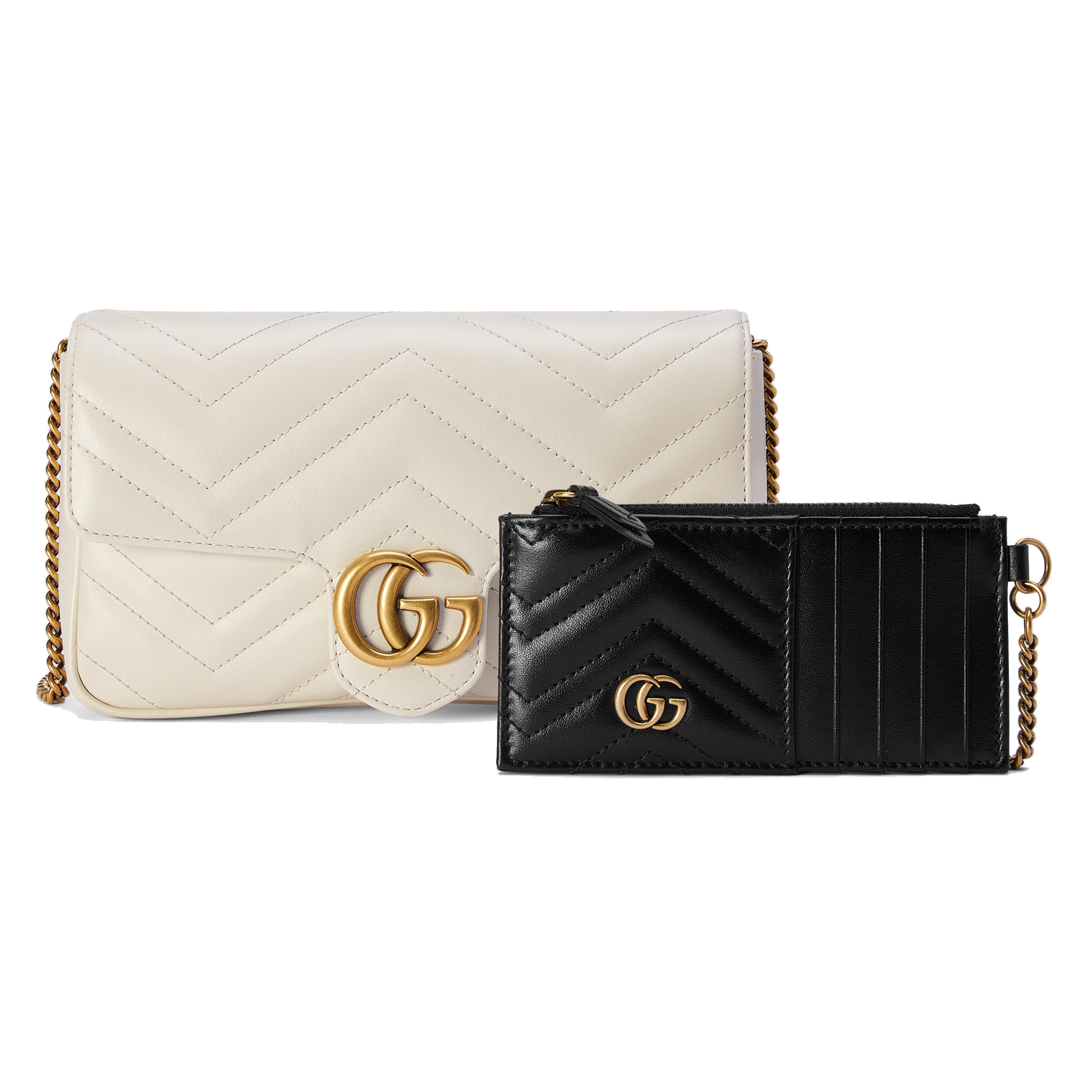 The Double G hardware brings the past into the House's present with the notion that a cherished wardrobe is enriched by items that can be worn season after season. This mini bag with a chain strap is crafted from the signature matelassé chevron leather in white, while the inside features a contrasting black leather card case that can be detached.