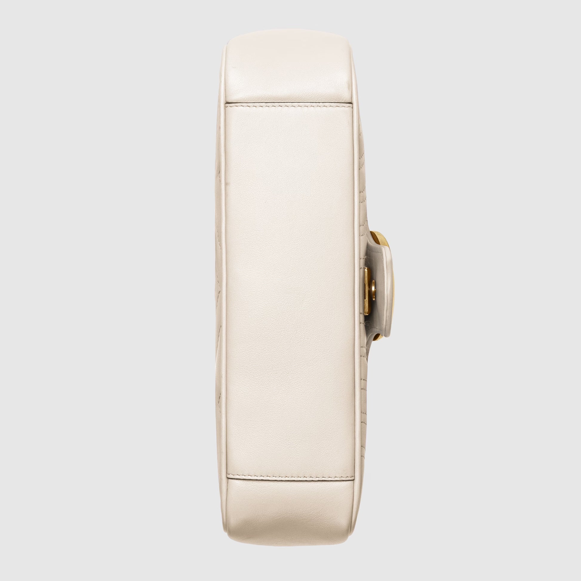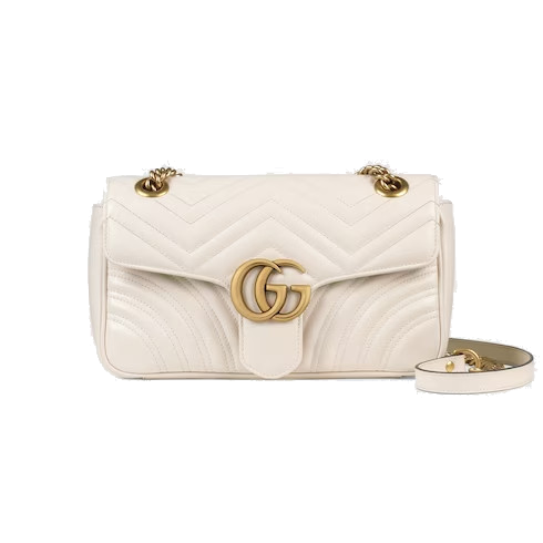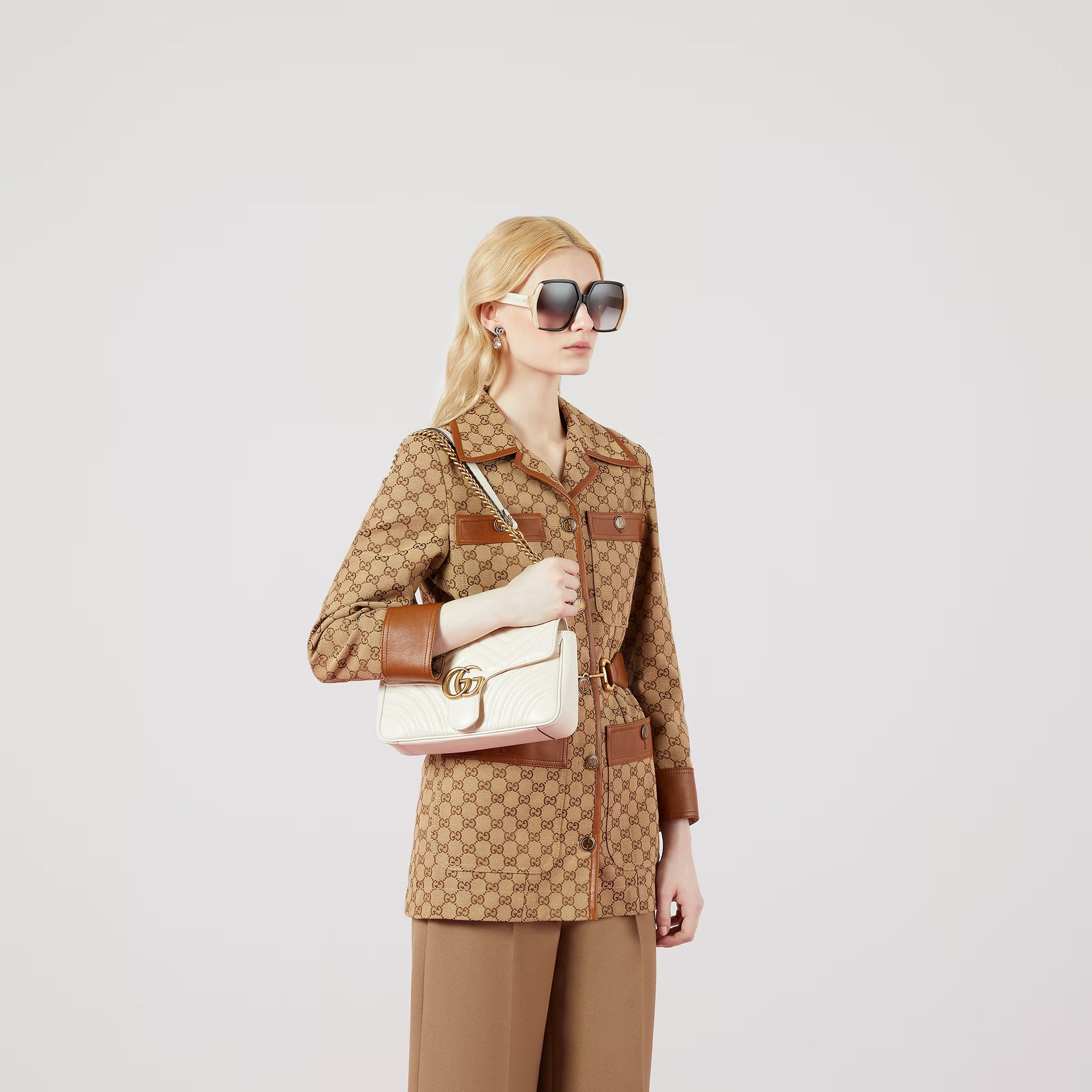 The small GG Marmont chain shoulder bag has a softly structured shape and an oversized flap closure with Double G hardware. The sliding chain strap can be worn multiple ways, changing between a shoulder and a top handle bag. Made in matelassé chevron leather with a heart on the back.