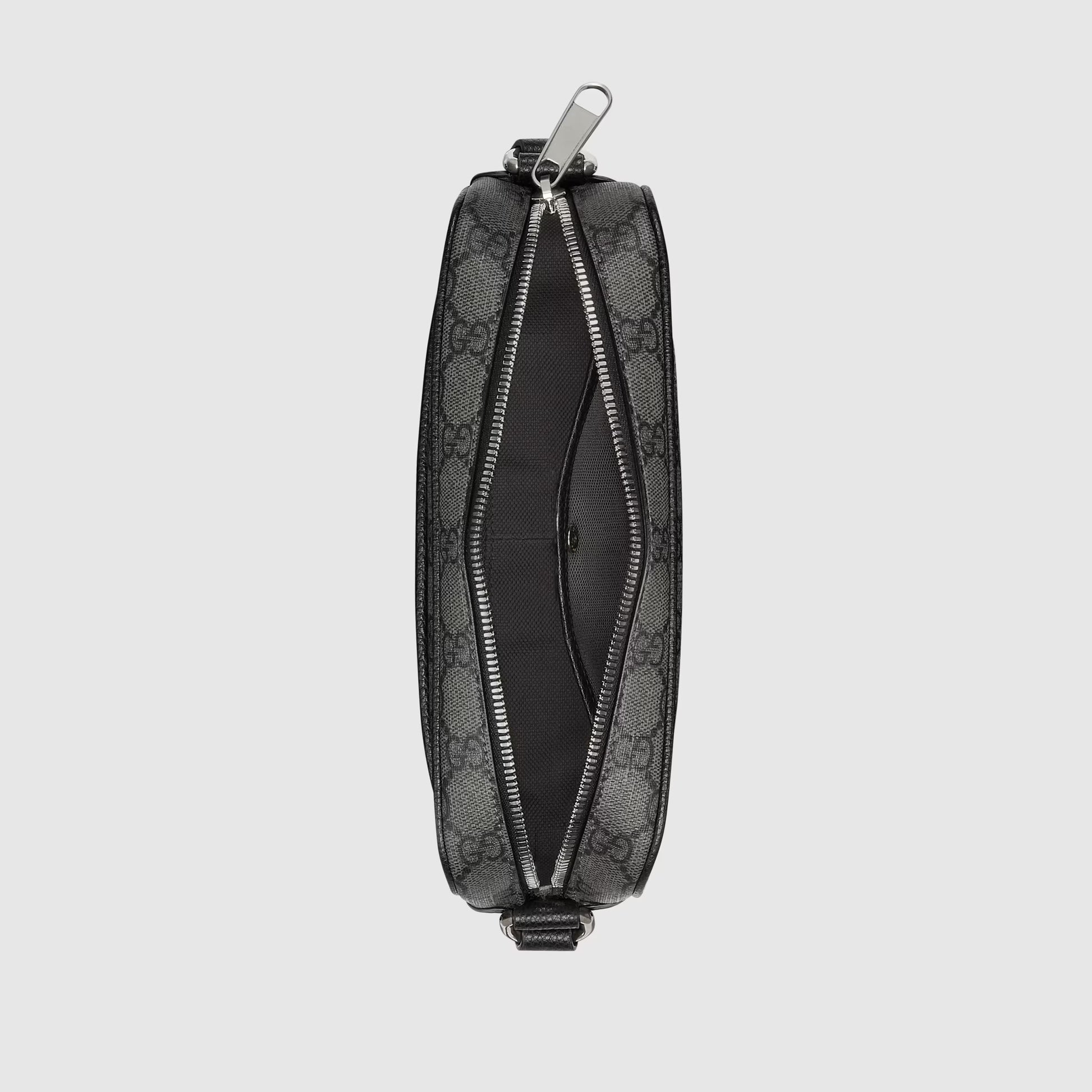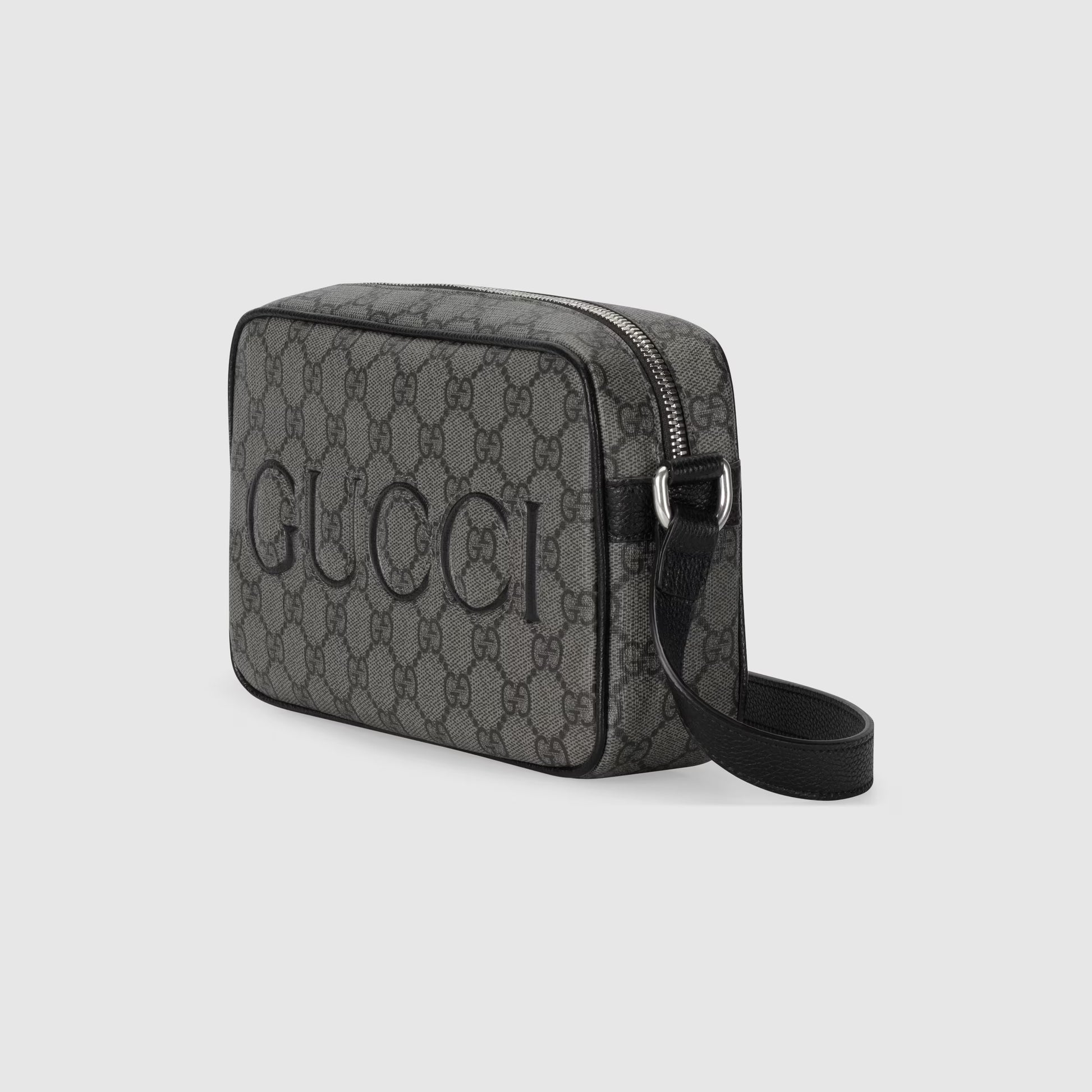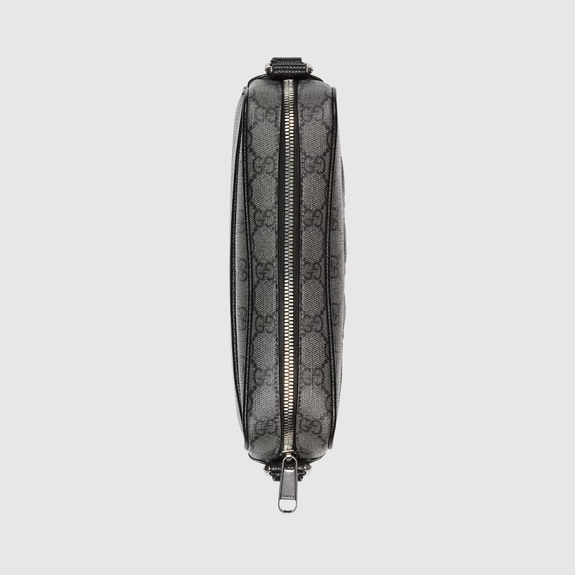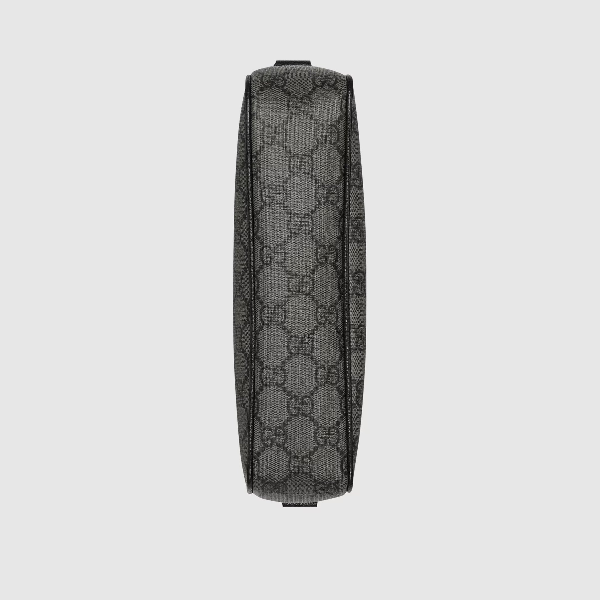 With a new combination of Supreme leather and canvas presented for Cruise 2024, the Brand's name becomes the detail that defines exclusive small accessories. Here the embedded Gucci logo appears in black on the gray and black GG Supreme canvas base of this mini shoulder bag.