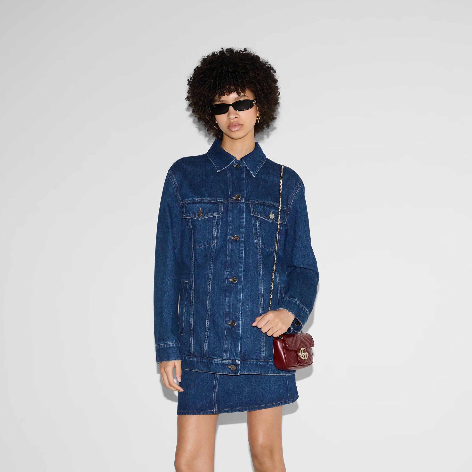 Presenting the House's red hue Gucci Rosso Ancora on the GG Marmont, this super mini shoulder bag presents the iconic style in a signature colour for Pre-Fall, complete with light gold toned hardware and ivory leather lining.