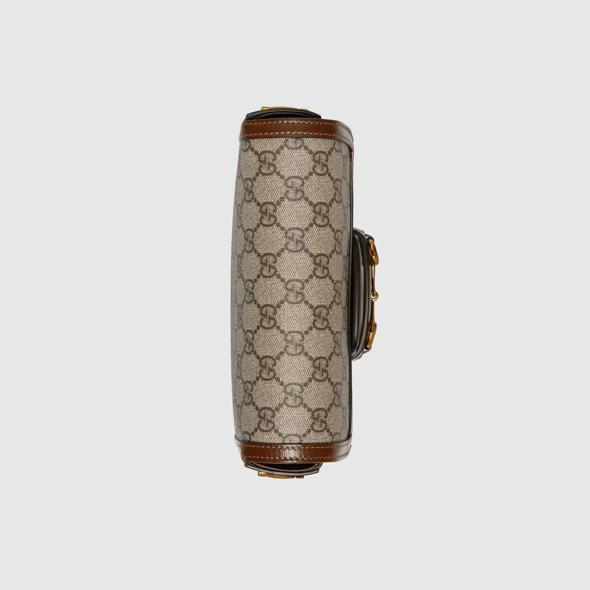 Petite versions of the Gucci Horsebit 1955 add a hybrid twist to the vintage inspired line. Enriched with two different shoulder straps, the mini bag’s character transforms from understated elegance with a tonal leather strap to a strong logo feel thanks to a red and green Web option. The accessory is presented in monogram canvas with a brown leather trim.