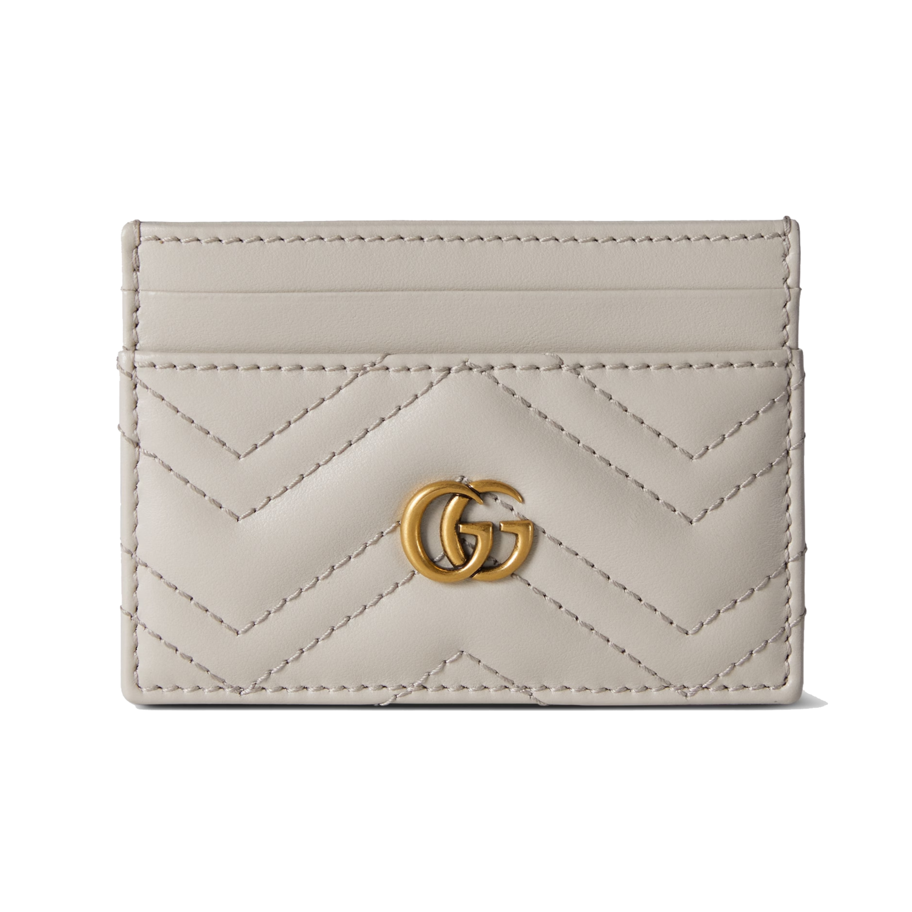 Monochromatic styles appear throughout the latest collection, adding a minimalist, contemporary touch to classic small accessories. Crafted from light gray chevron matelassé leather, this GG Marmont card holder features a tonal Double G trim..