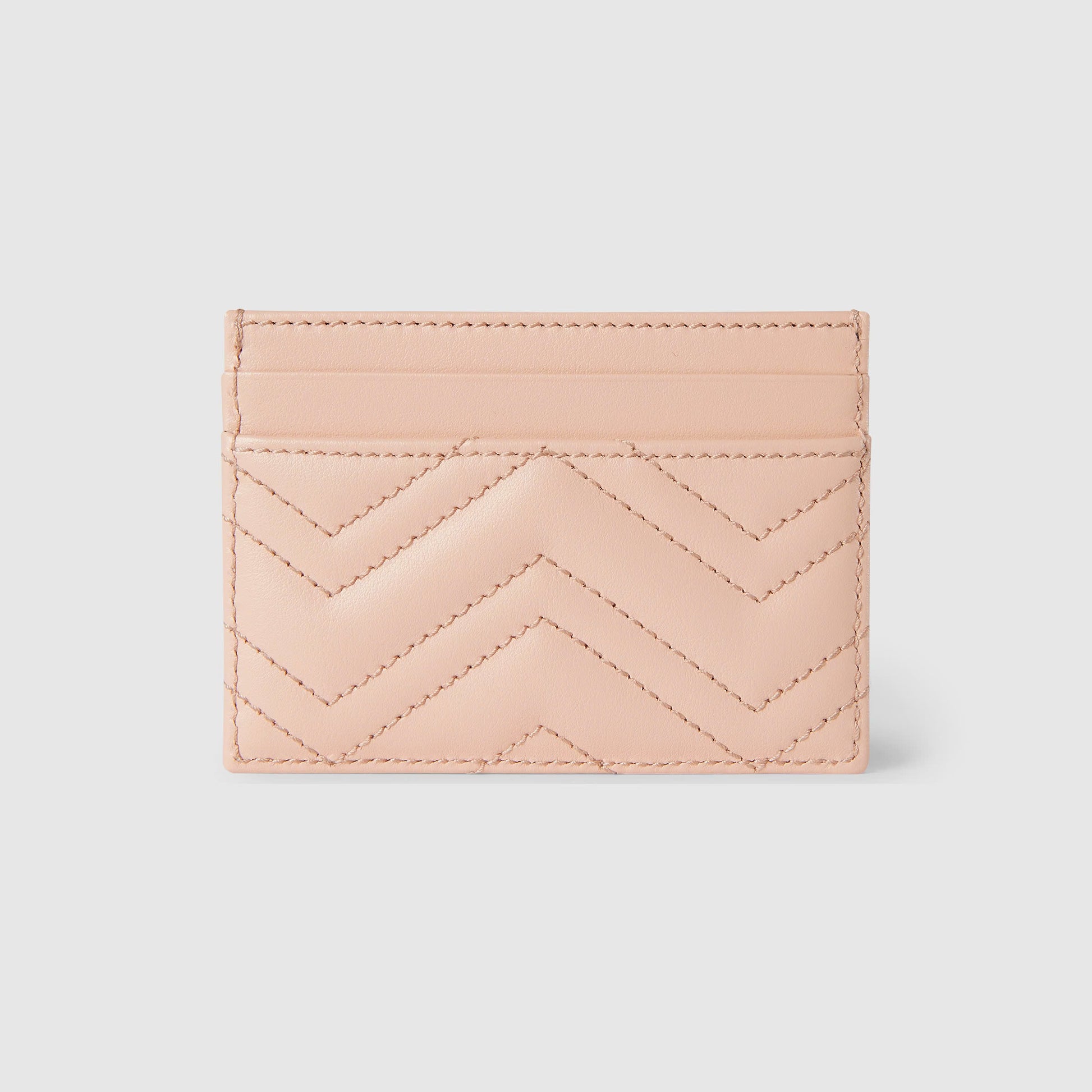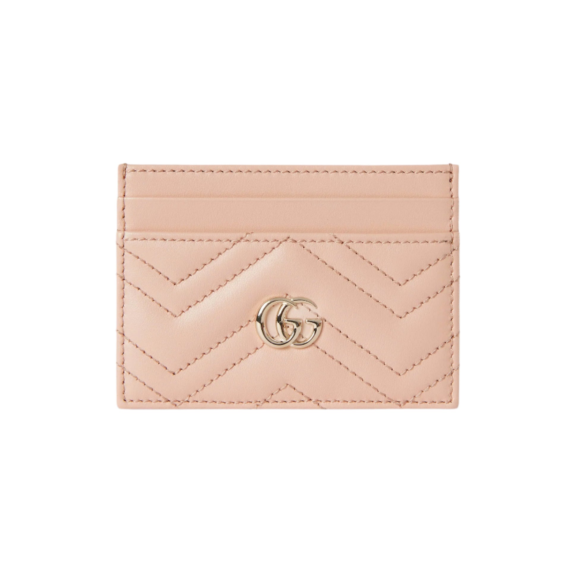 The GG Marmont card case is crafted from matelassé chevron leather in a delicate light pink shade for the Cruise 2025 collection. The shape is defined by the line's emblematic Double G hardware, an archival symbol from the 1970s that has become a hallmark of the House.