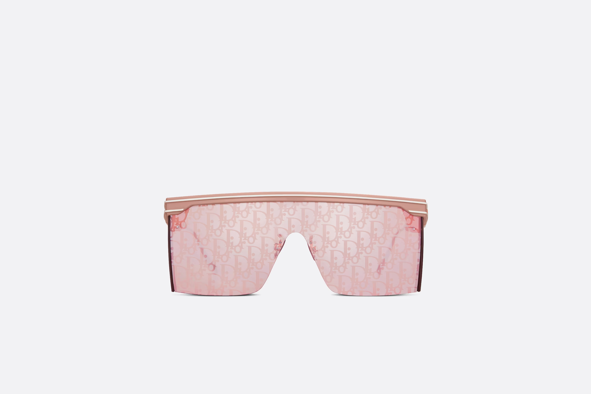 The DiorClub M1U sunglasses are a rectangular-shaped mask with a sportswear appeal. In keeping with the silver mirrored lenses in a pink Dior Oblique motif, the design features large spoilers that lend a modern and graphic touch. The pink matte acetate frame contrasts with a brilliant-finish white line detail and Christian Dior signature.