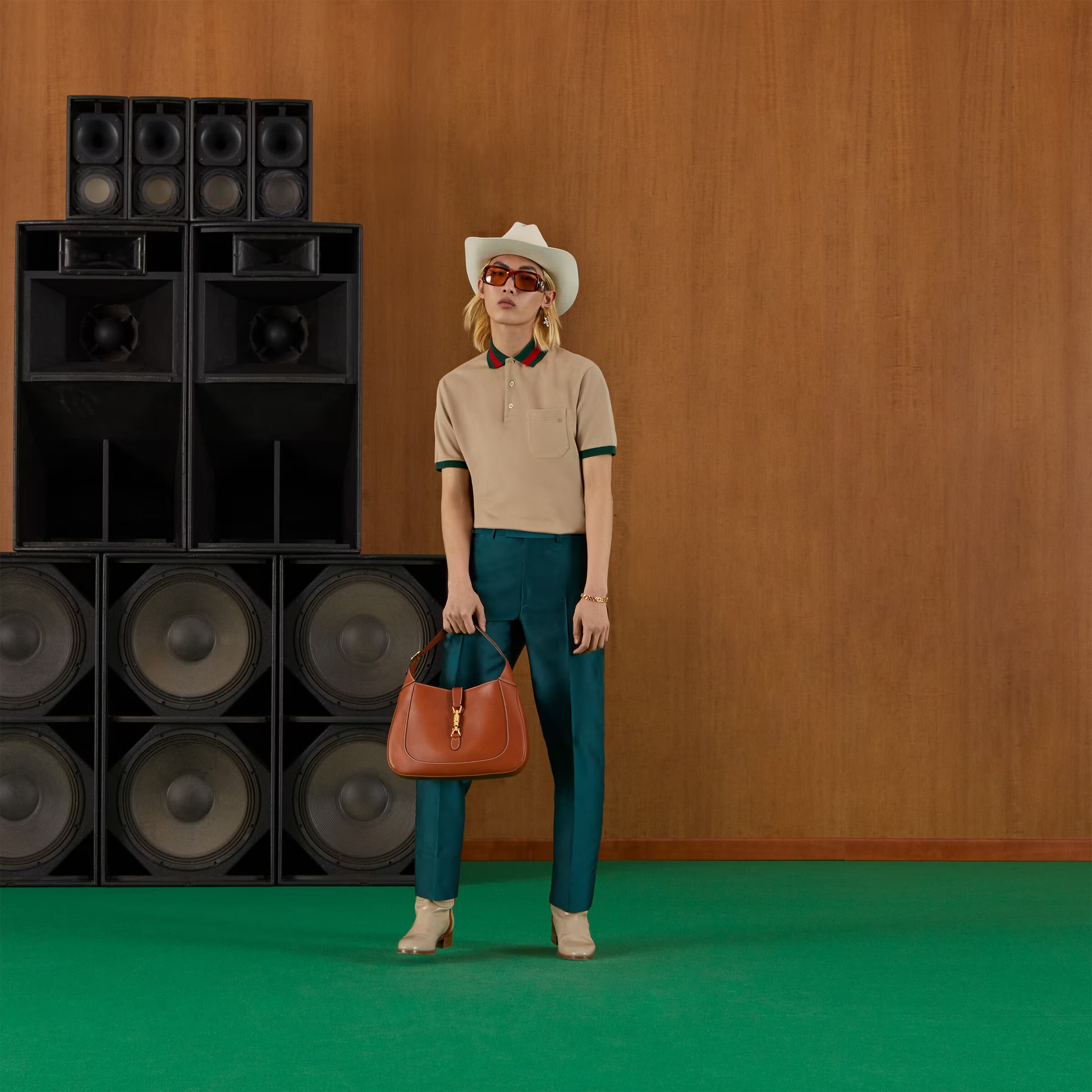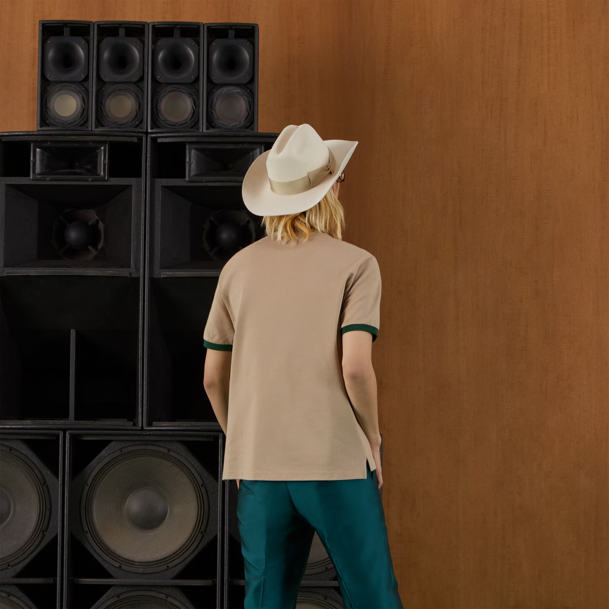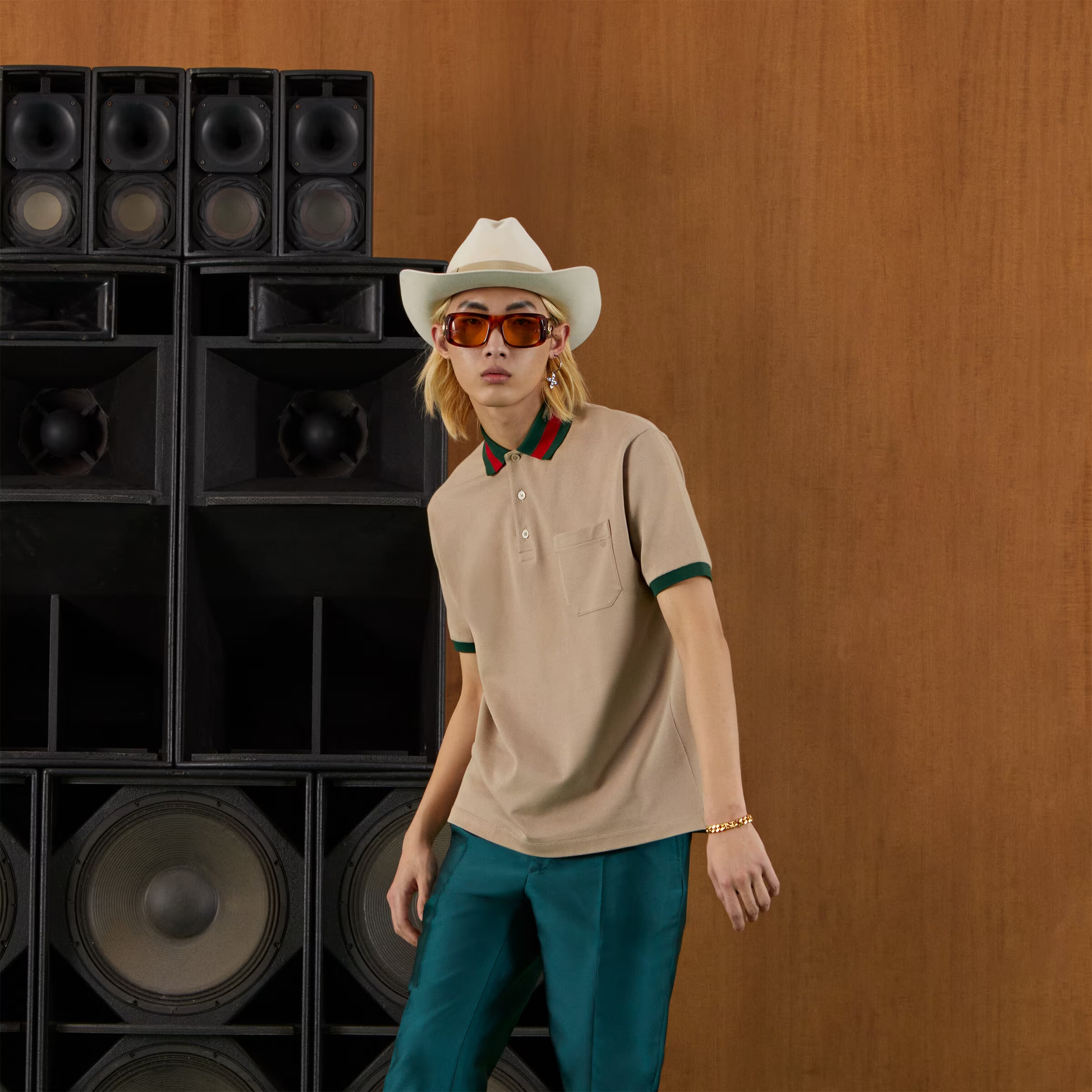 The House's emblematic green and red Web is reworked as the collar of this cotton piquet polo shirt. The preppy influence seen throughout the House narrative continues to evolve.
