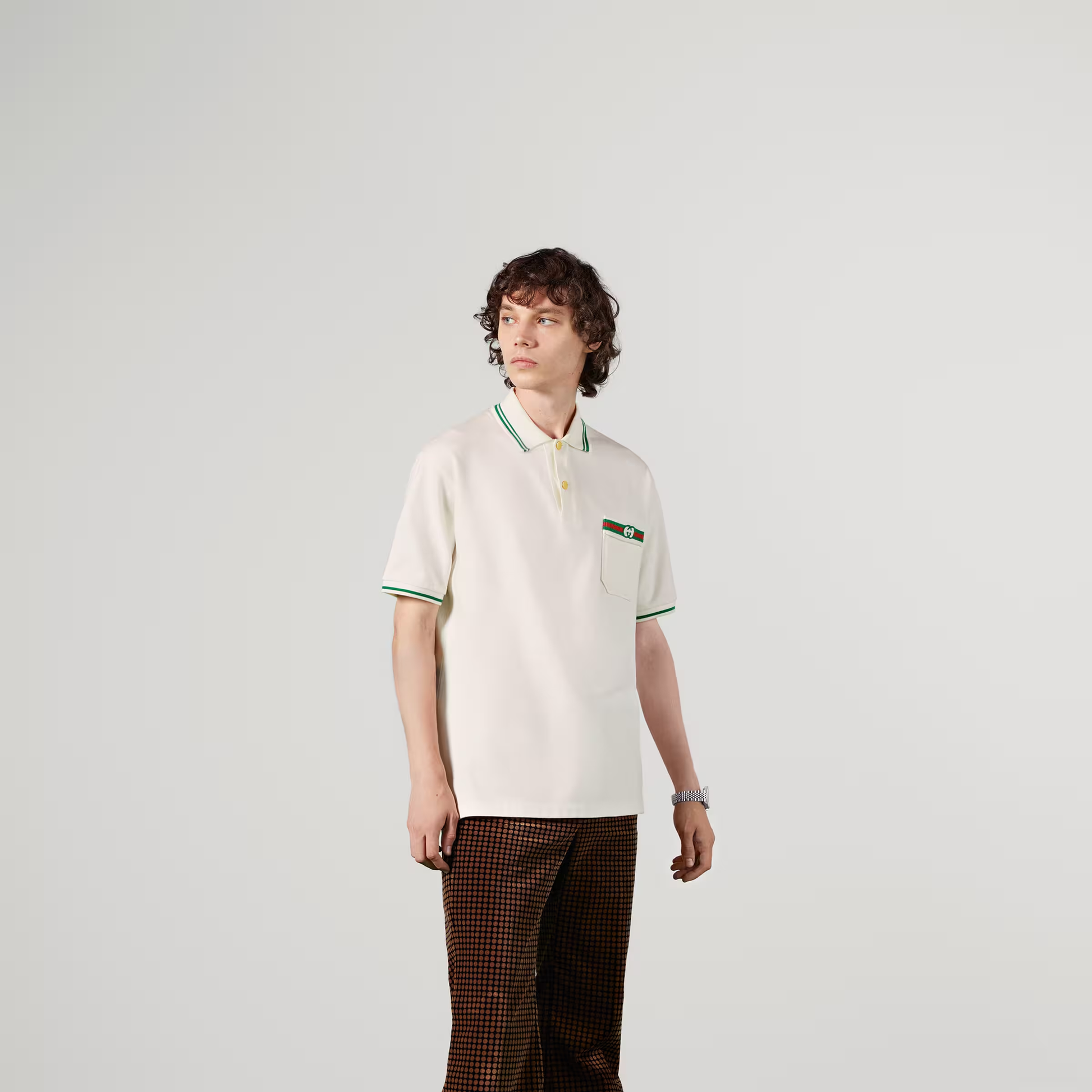 Part of the preppy influence seen throughout the House narrative, this white cotton polo has green stripes along the collar and the arm openings. The embroidery on the front pocket combines two emblematic symbols from the archives and speaks to Gucci's equestrian heritage.