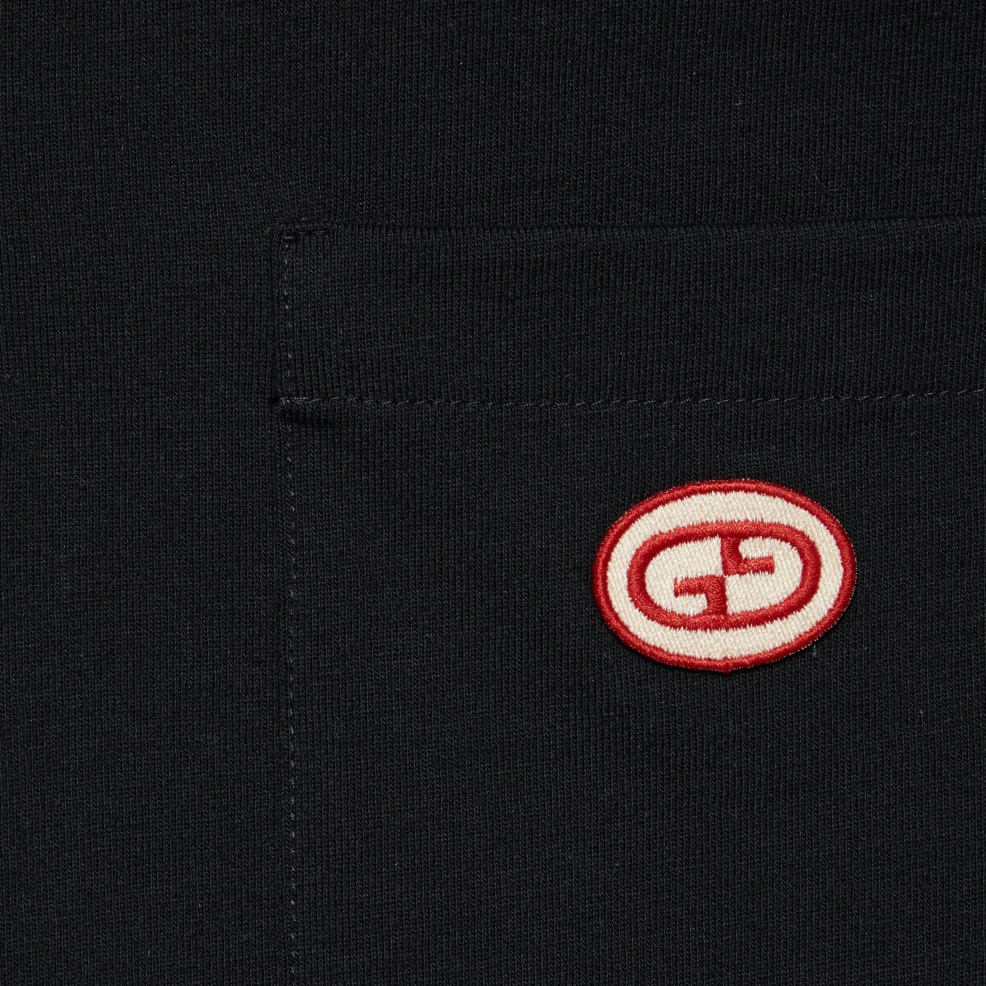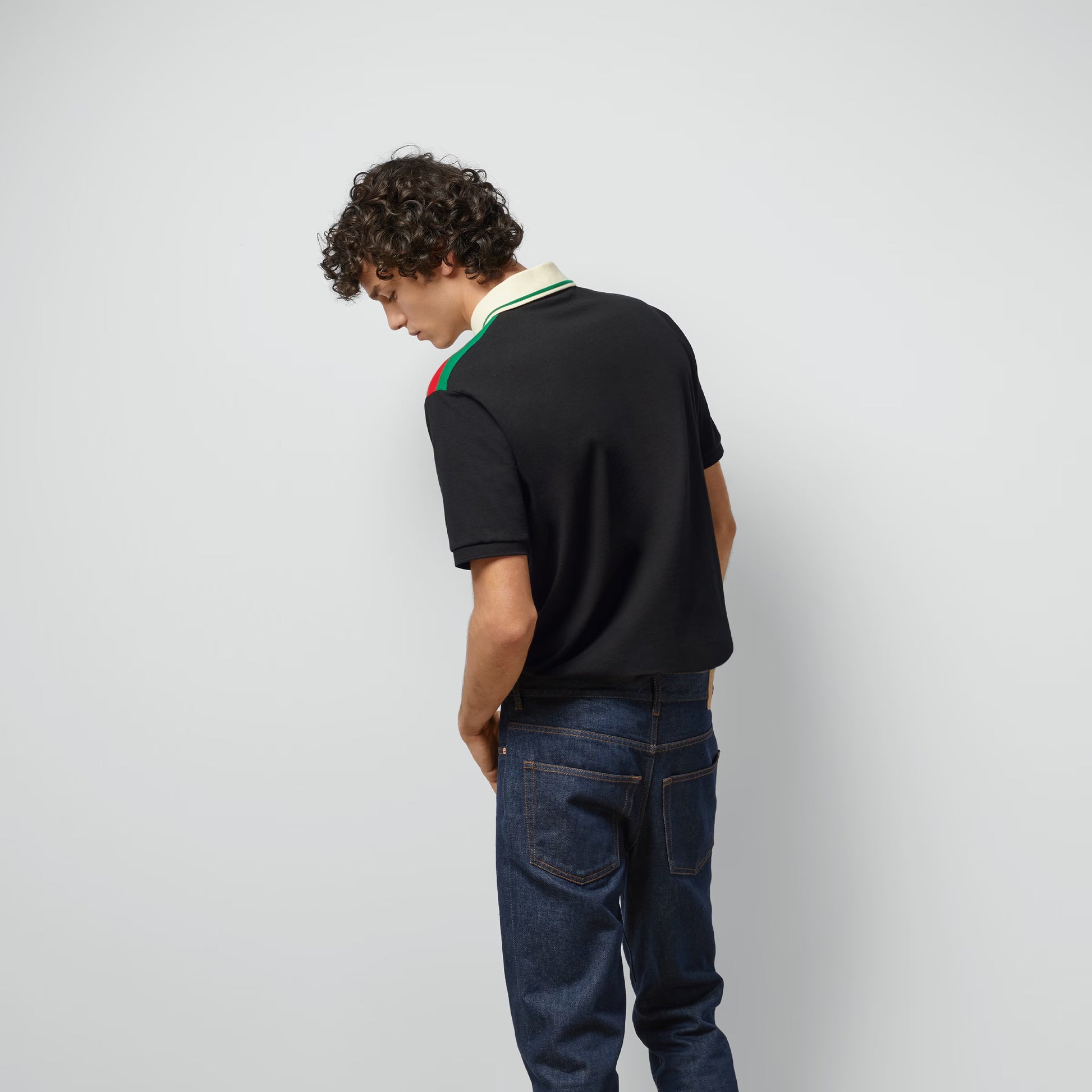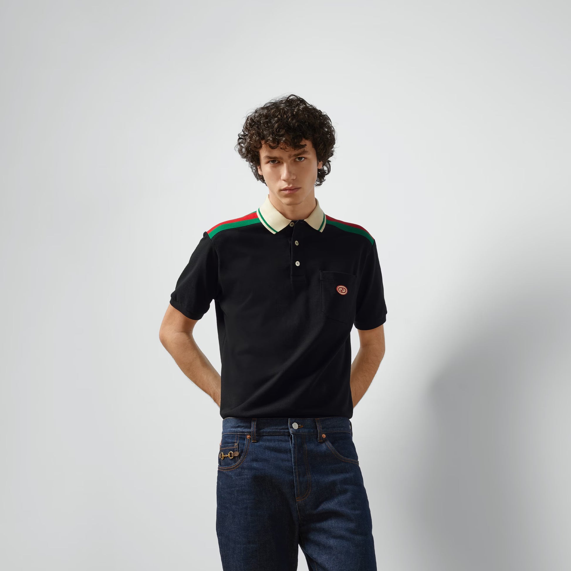The men's Cruise 2024 collection presents a contemporary silhouette. Voluminous trousers are paired with fitted jackets, while relaxed cargo pants worn with outerwear pieces offer a sporty edge. Presented in black heavy cotton jersey, this sleek polo shirt is defined by a green and red Web stripe and a retro GG embroidered patch.