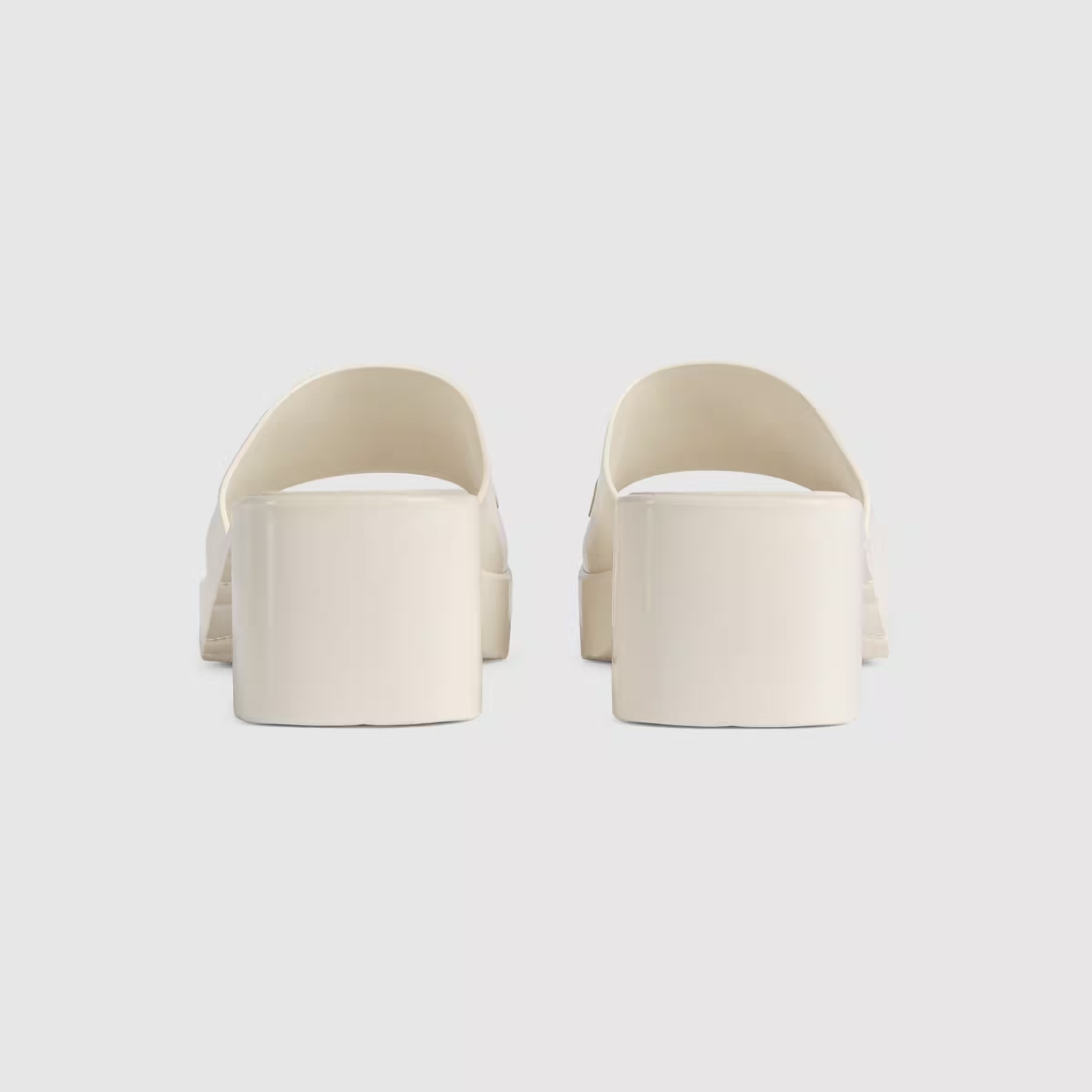 A playful twist on an essential style, the slide sandal is presented in white rubber for the Pre-Fall 2020 collection. Recalling '90s style, a chunky heel and embossed logo add a retro appeal.