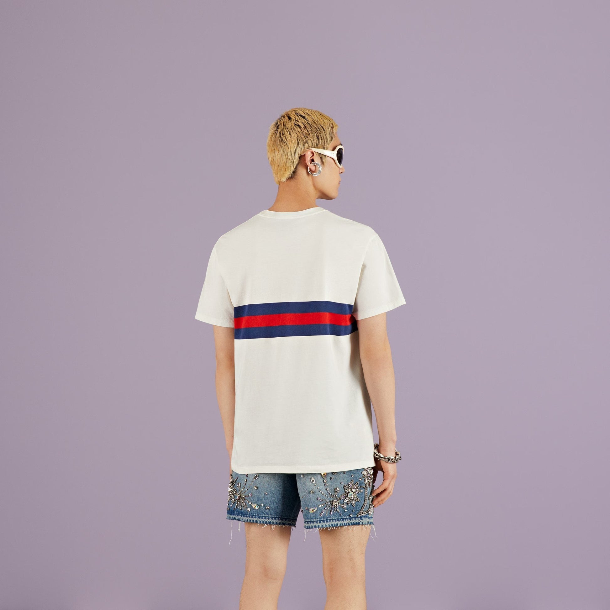 The Gucci vintage logo was inspired by prints from the eighties. The retro-style motif is presented with an extended Web as part of Cruise 2023 Gucci Cosmogonie on this short sleeve cotton jersey T-shirt.