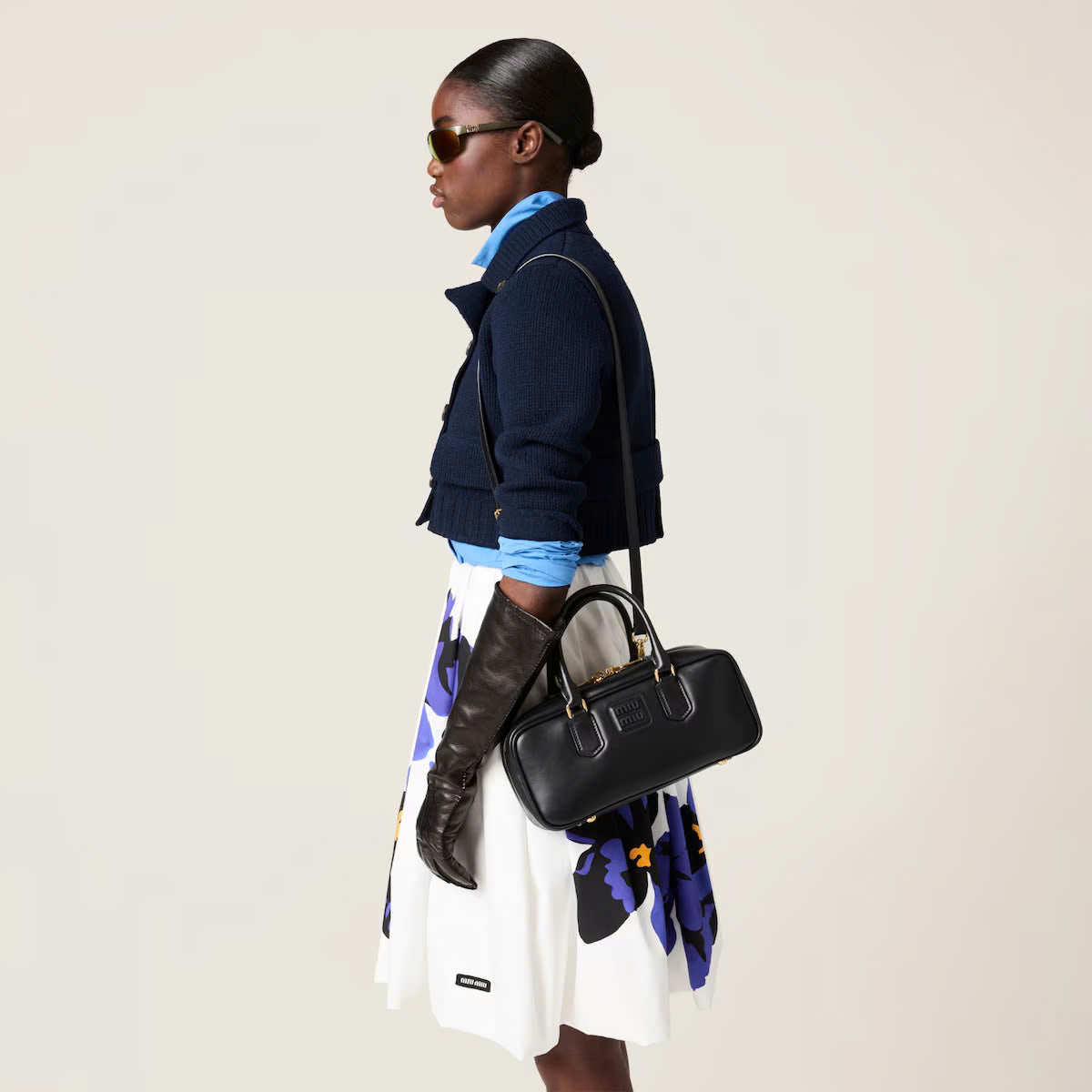 This Arcadie leather bag expresses a concept of fashion as a means for translating a reaction to current reality into a particular shape. The light padding gives a voluminous appearance and cosmopolitan style to the accessory. The lettering logo crosses the boundaries between function and decoration and helps define the distinctive and iconic aesthetic of the top-handle bag.