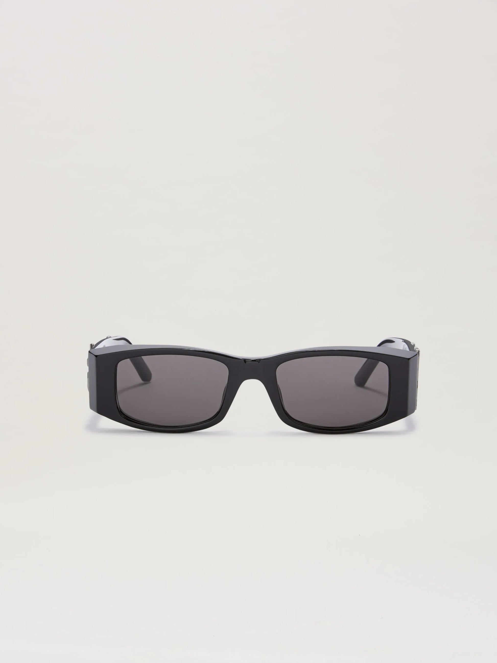 ACCESSORIES THAT ENHANCE YOUR PERSONALITY. BLACK ACETATE RECTANGULAR FRAME SUNGLASSES WITH BLACK LENSES, MAXI TEMPLES WITH GALVANIZED METAL PALM ANGELS LOGO IN RELIEF.