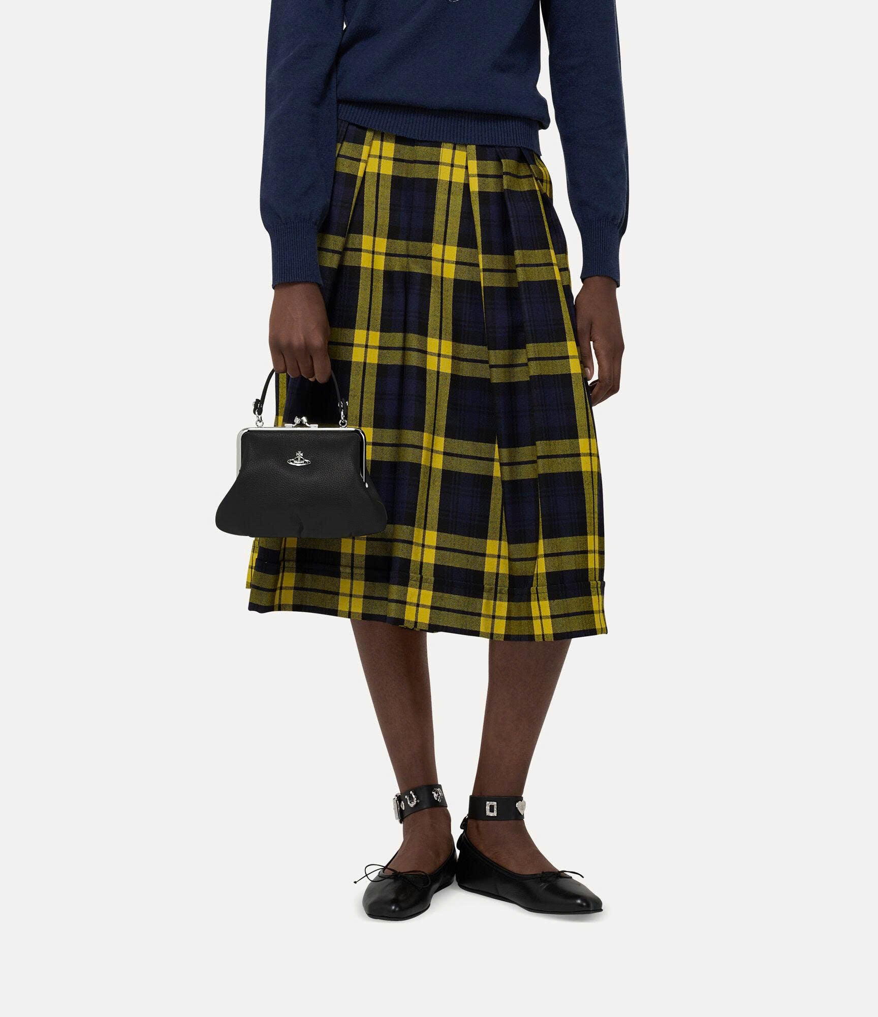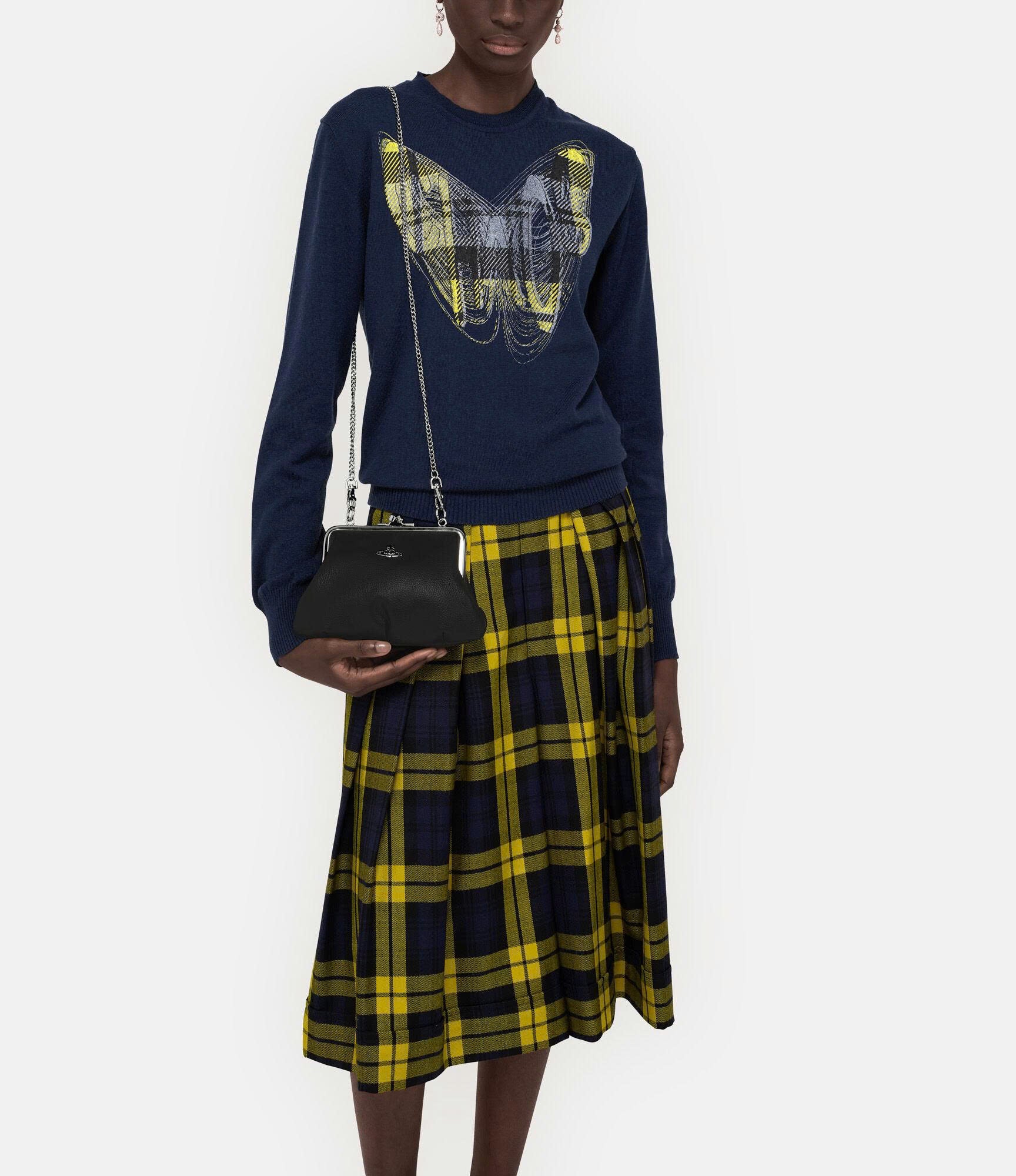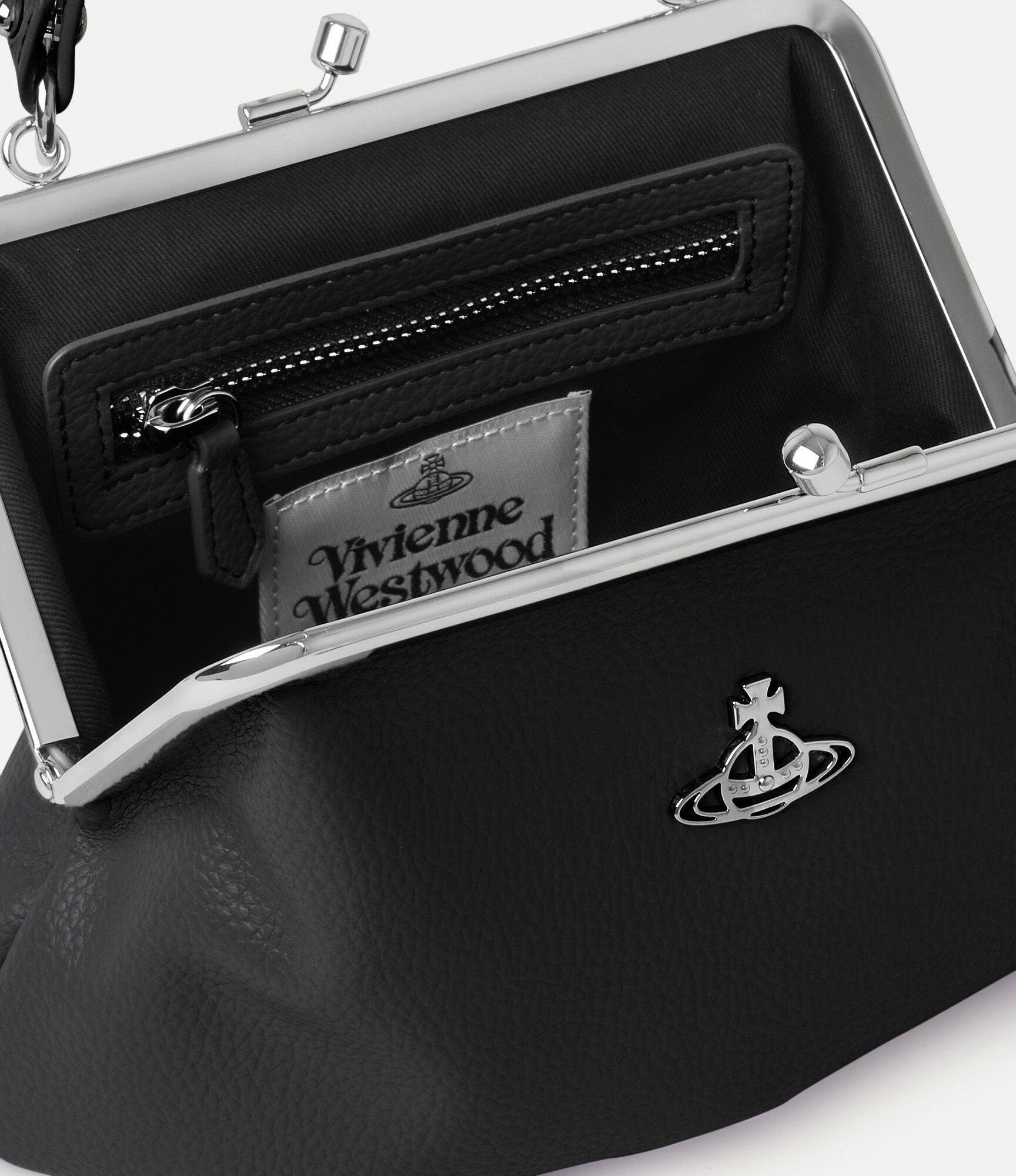 The design of the Granny Frame purse references early 20th-century coin purses, offering an exposed polished framework and a kiss-lock clasp, complete with a grain-embossed finish. At the centre sits a silver-tone orb motif, which symbolises tradition, encircled by the celestial rings of Saturn, symbolising the future.