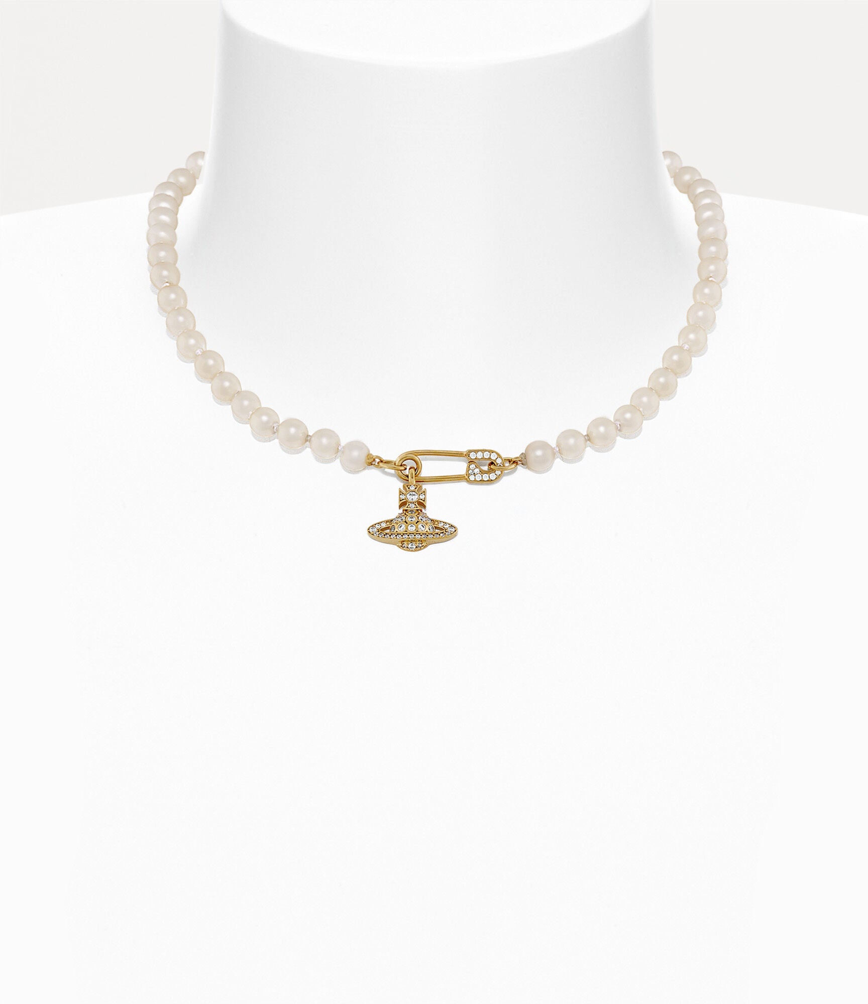 Held together by a string of pearls, the Lucrece Pearl necklace is designed with a crystal-encrusted orb and a safety pin motif.